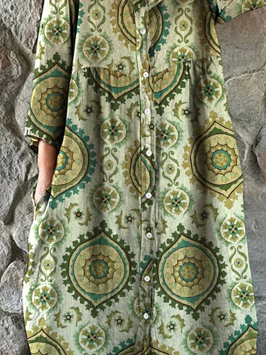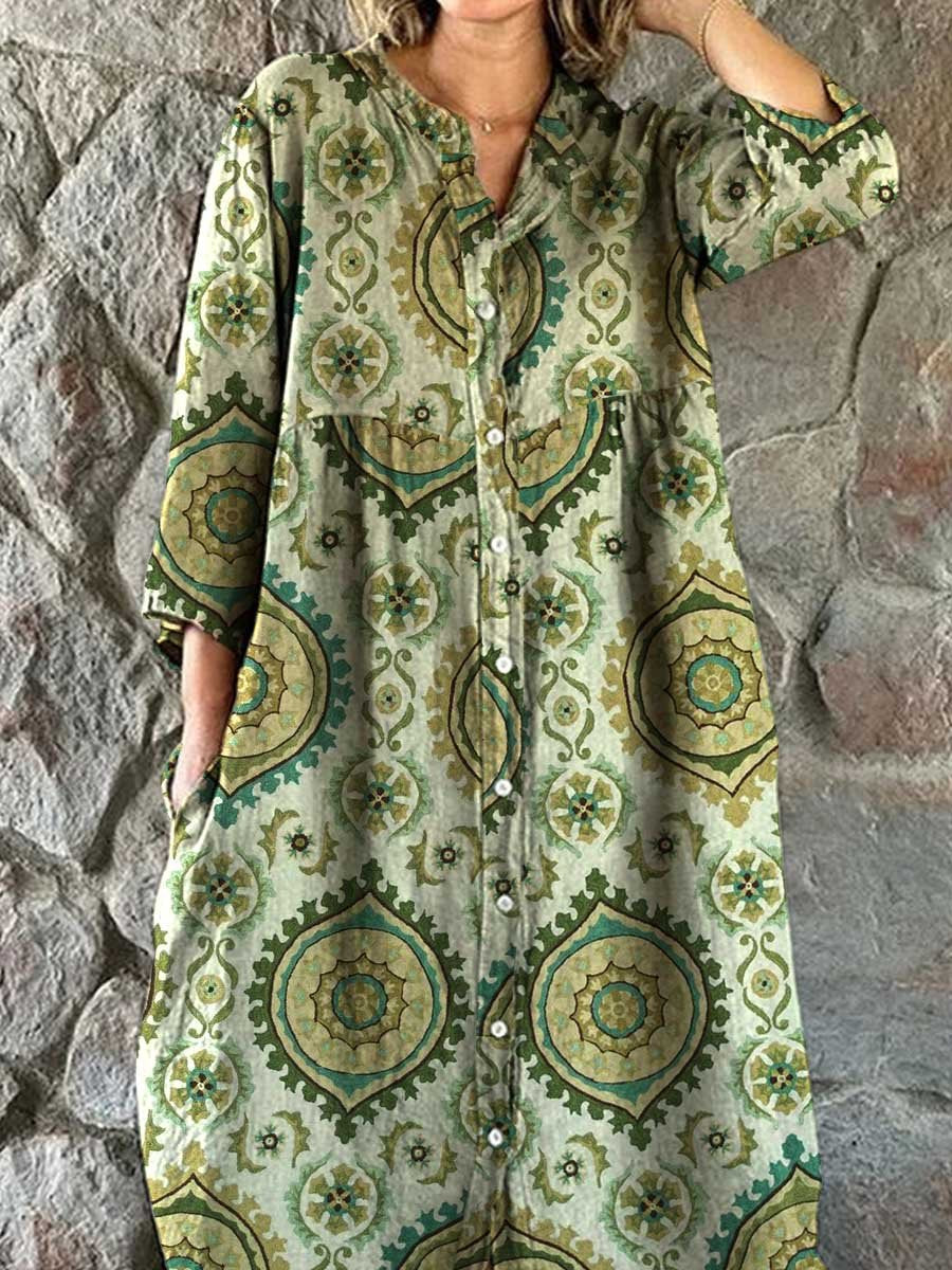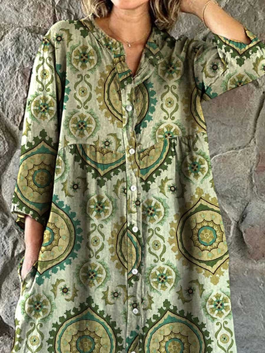 Women's Boho Pattern Shirt Style Cotton and Linen Dress