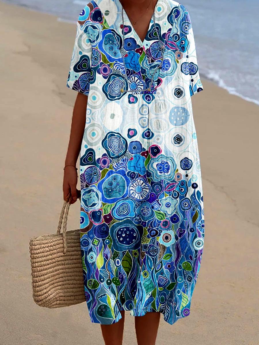Women's Elegant Art Geometric Pattern V-Neck Flowing Linen Dress