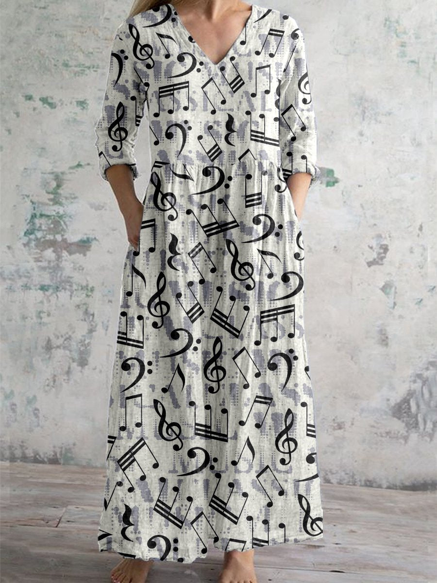 Women's Elegant Art Note Pattern Cotton and Linen Dress with Pockets