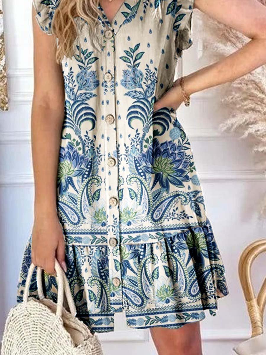 Women's Elegant Bohemian Geometric Pattern Graphic Ruffle Sleeve Hem Dress
