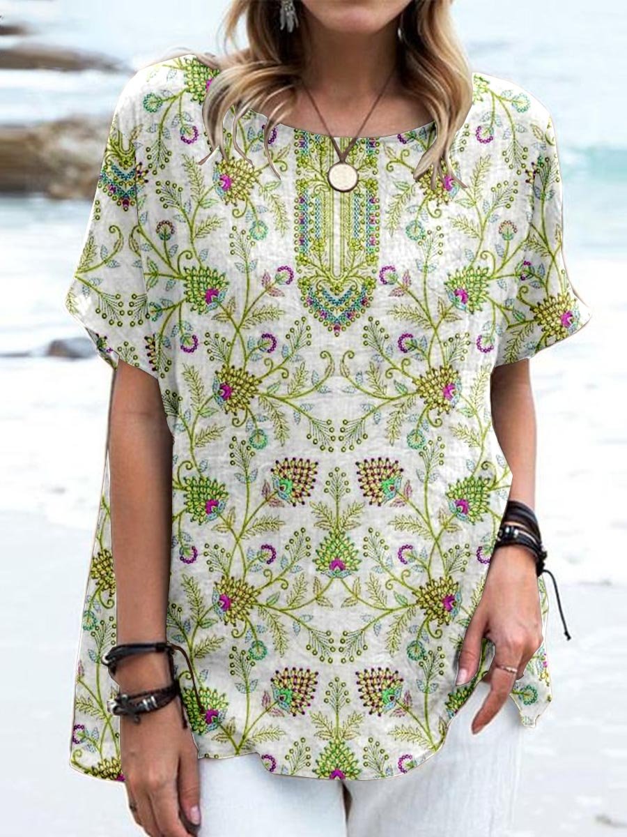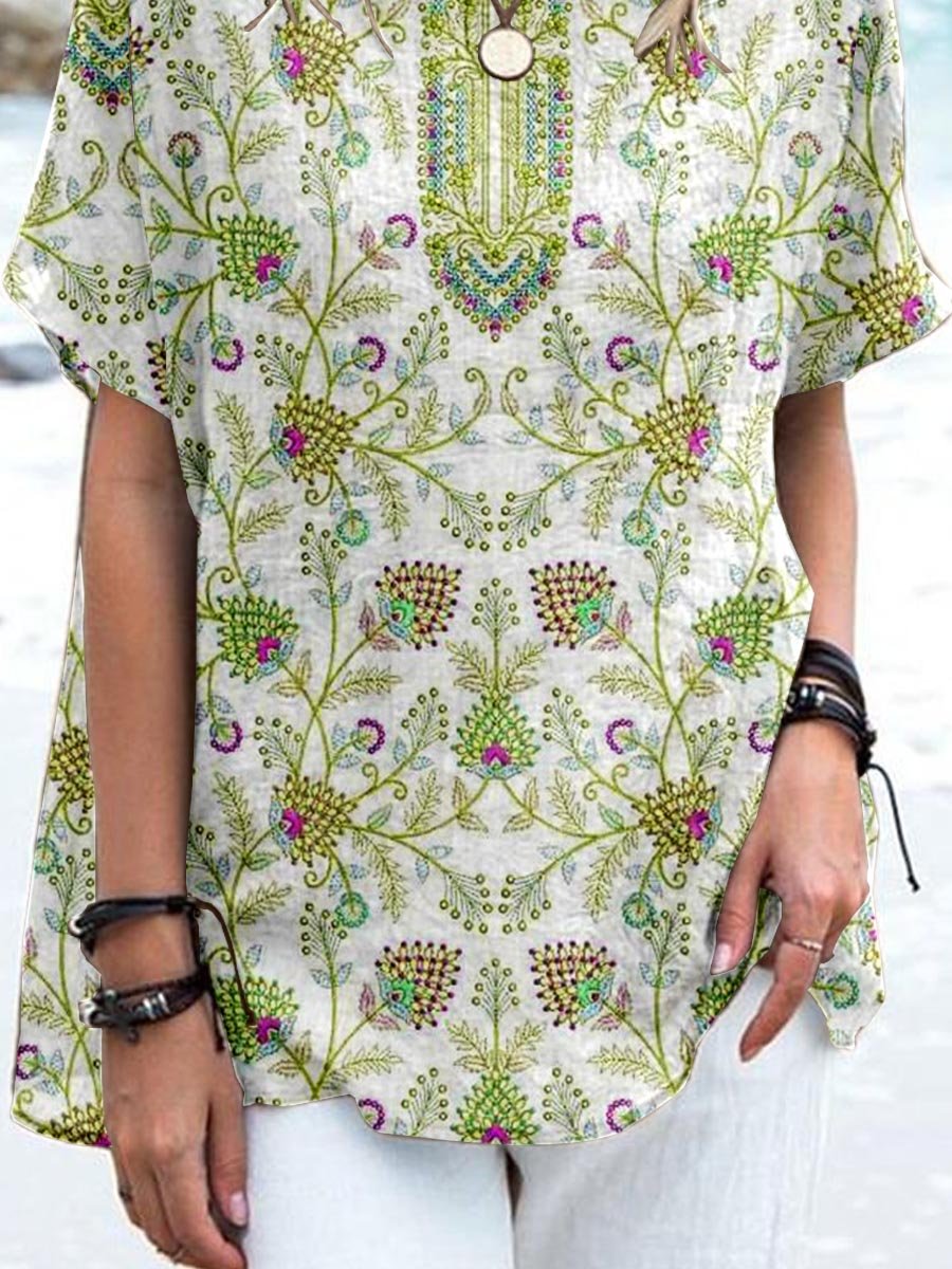 Women's Elegant Boho Geometric Pattern Cotton and Linen Top