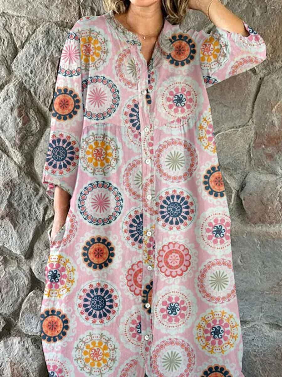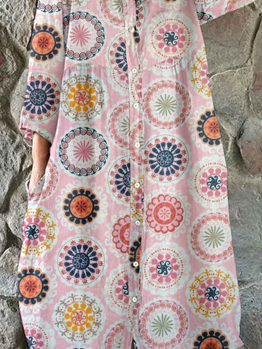 Women's Elegant Boho Pattern Shirt Style Cotton and Linen Dress