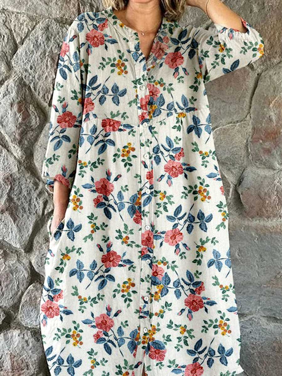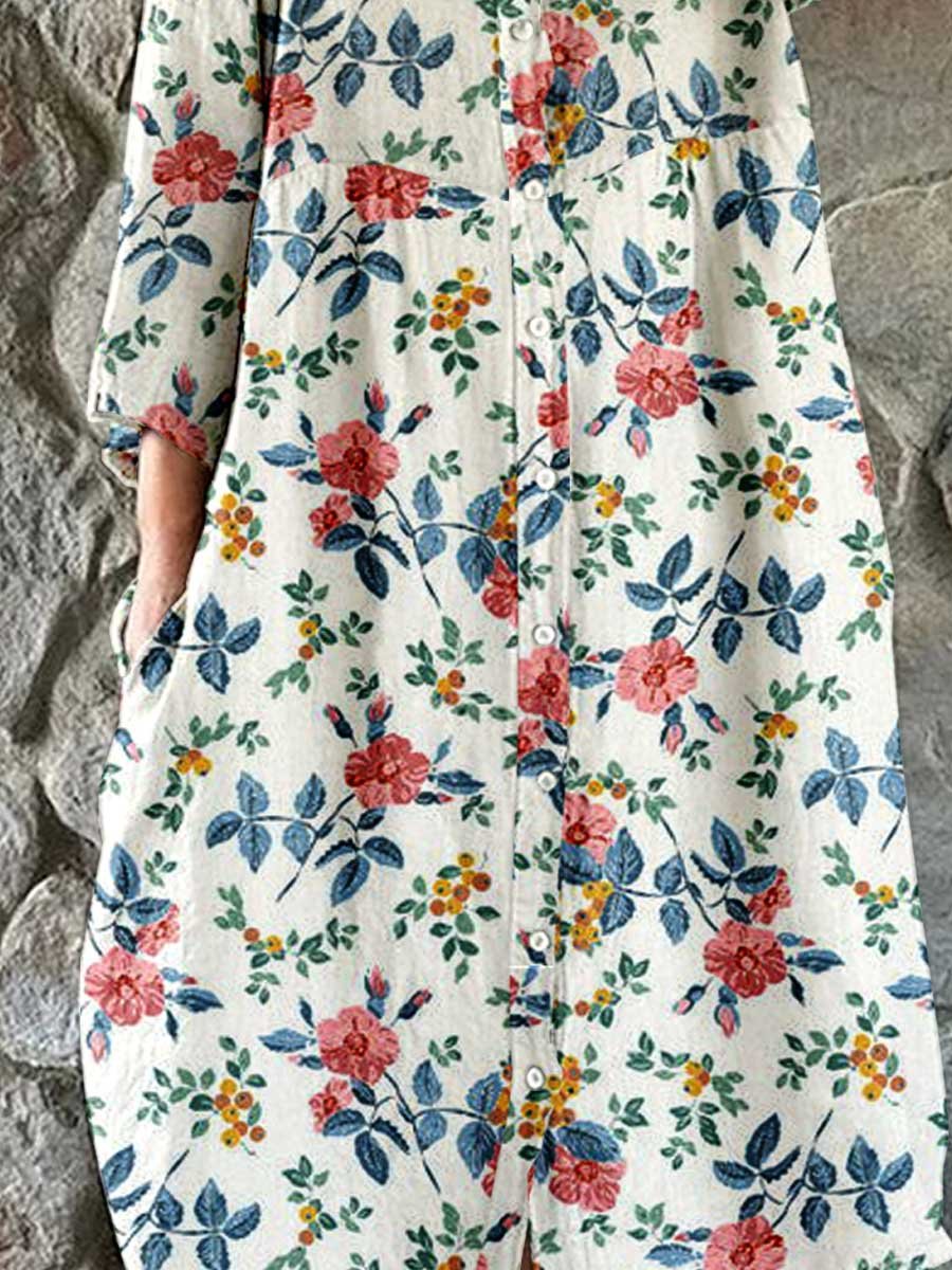 Women's Elegant Floral Pattern Shirt Style Cotton and Linen Dress