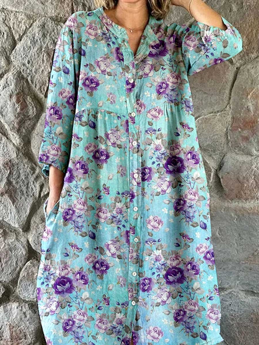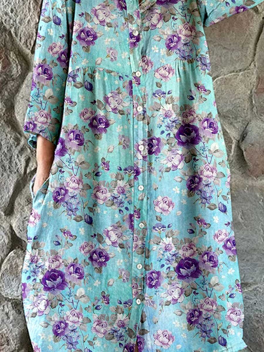Women's Elegant Floral Pattern Shirt Style Cotton and Linen Dress