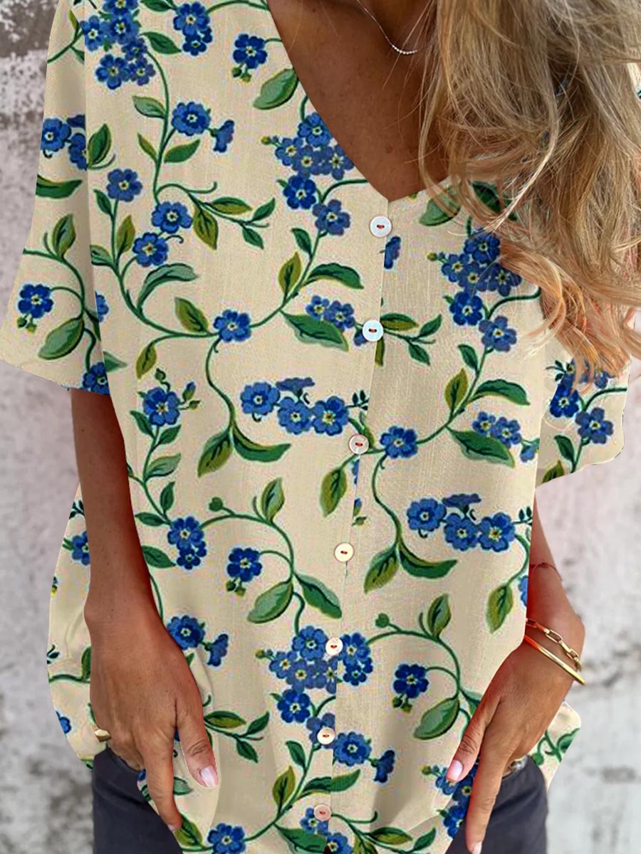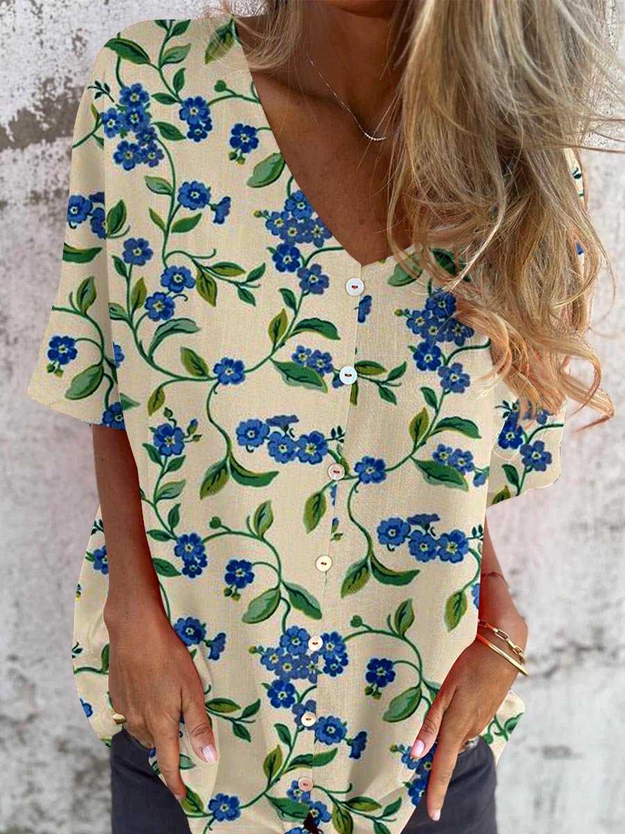 Women's Elegant Floral Pattern Shirt Style Cotton and Linen Top