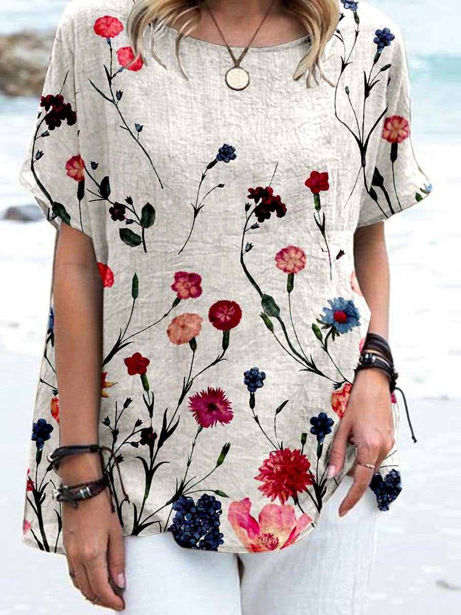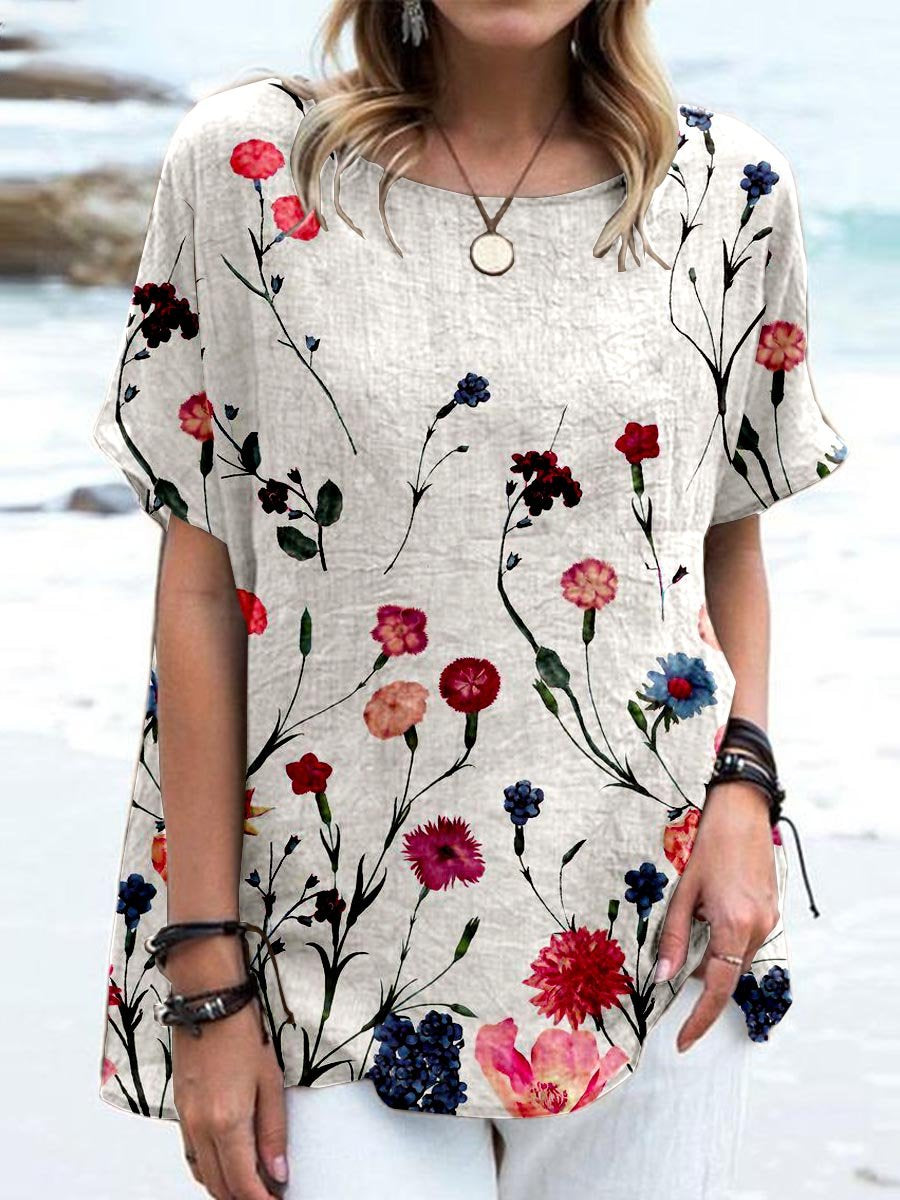 Women's Elegant Floral Print Cotton and Linen Top