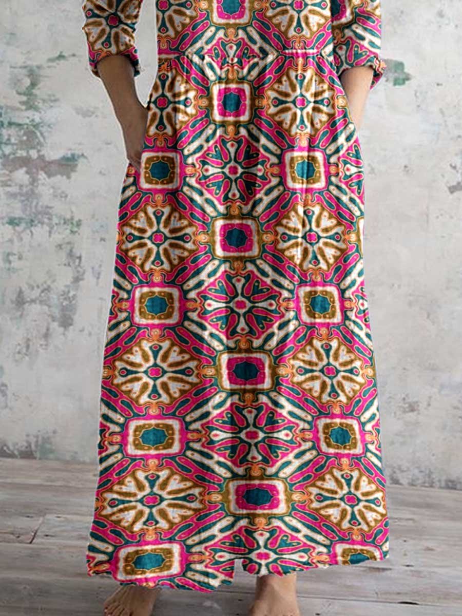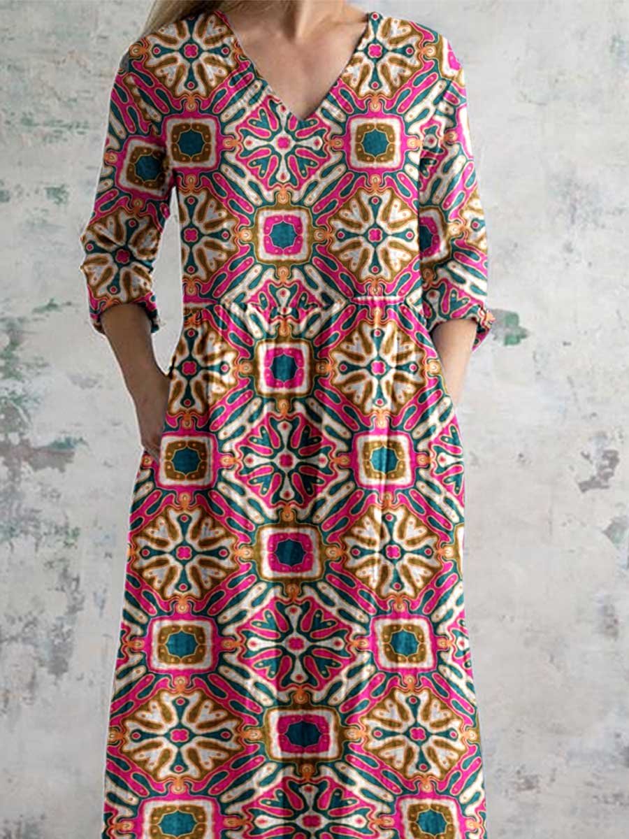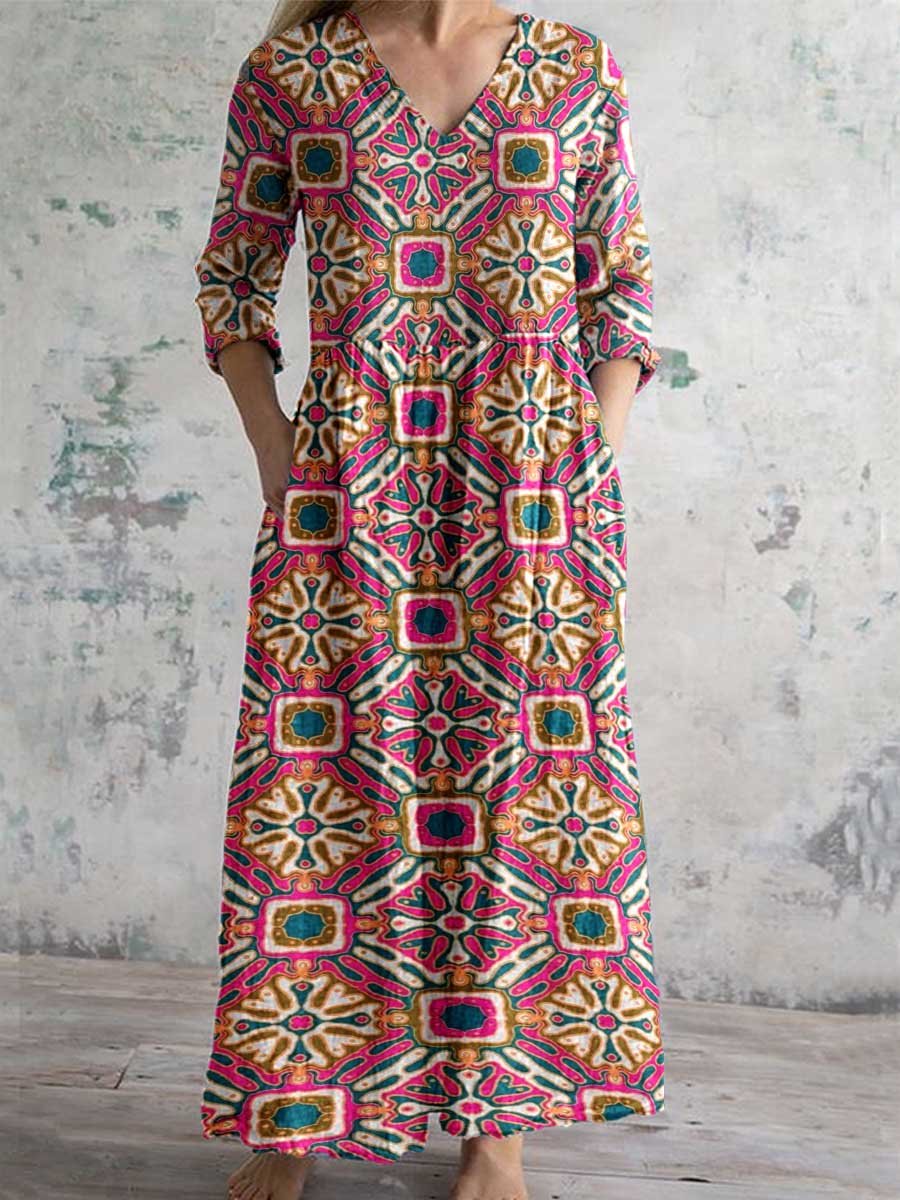 Women's Elegant Retro Geometric Floral V-Neck Cotton and Linen Dress with Pockets