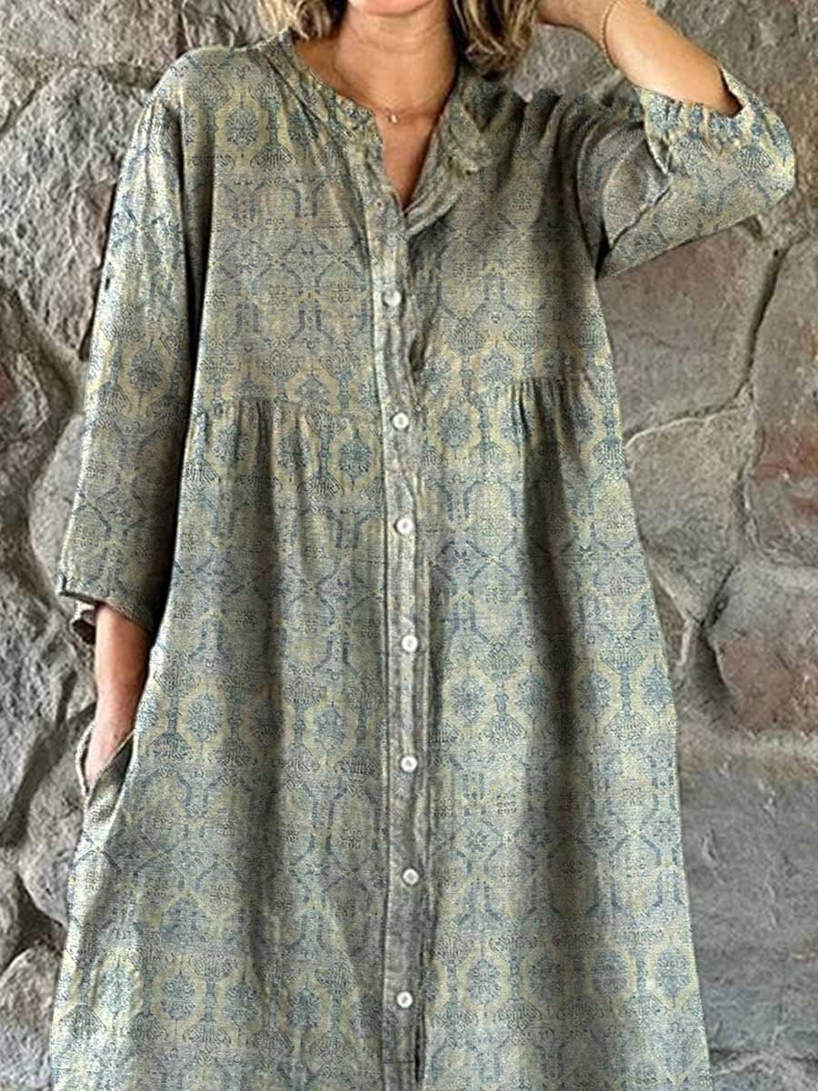 Women's Elegant Retro Rose Texture Pattern Shirt Style Cotton and Linen Dress