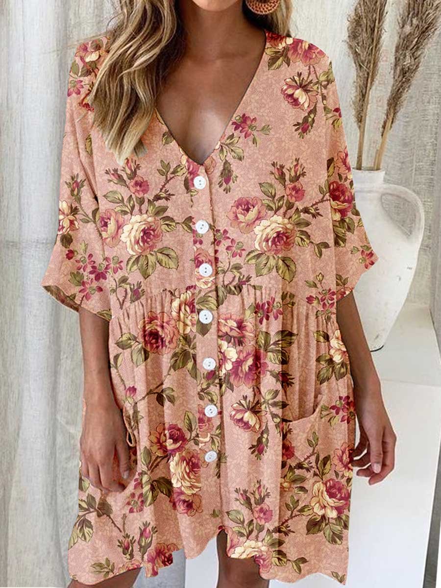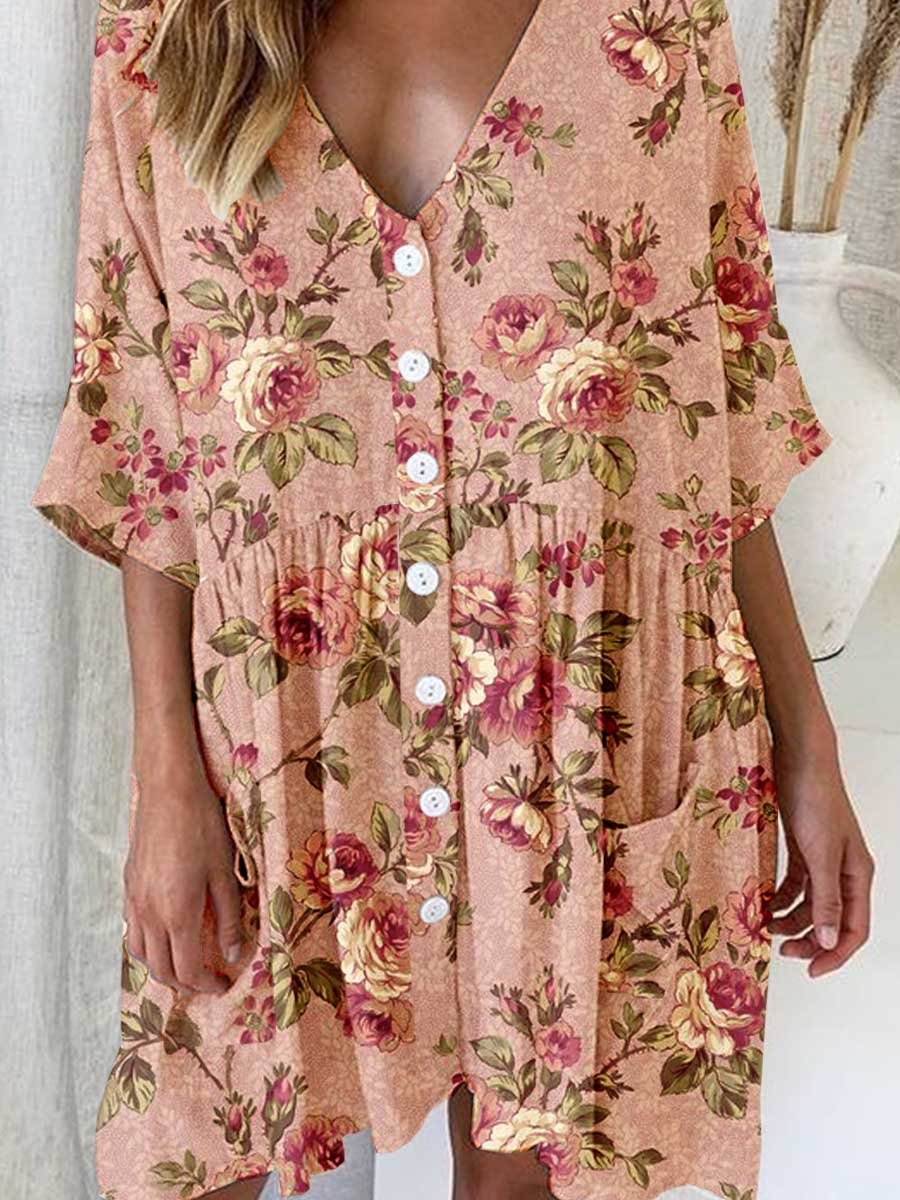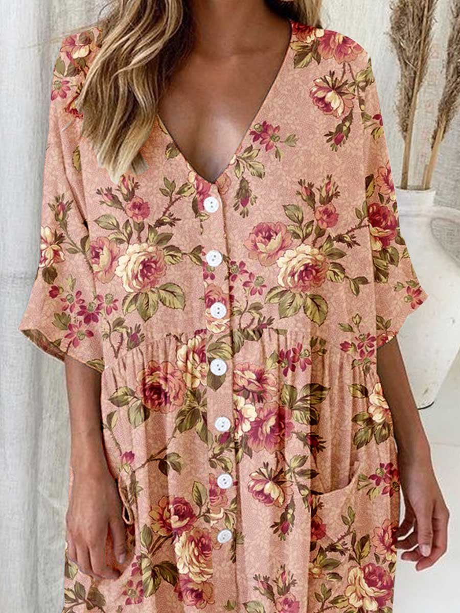 Women's Elegant Rose Floral Pattern V-Neck Cardigan Cotton and Linen Dress