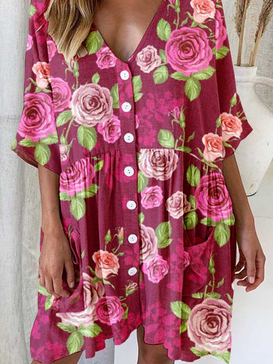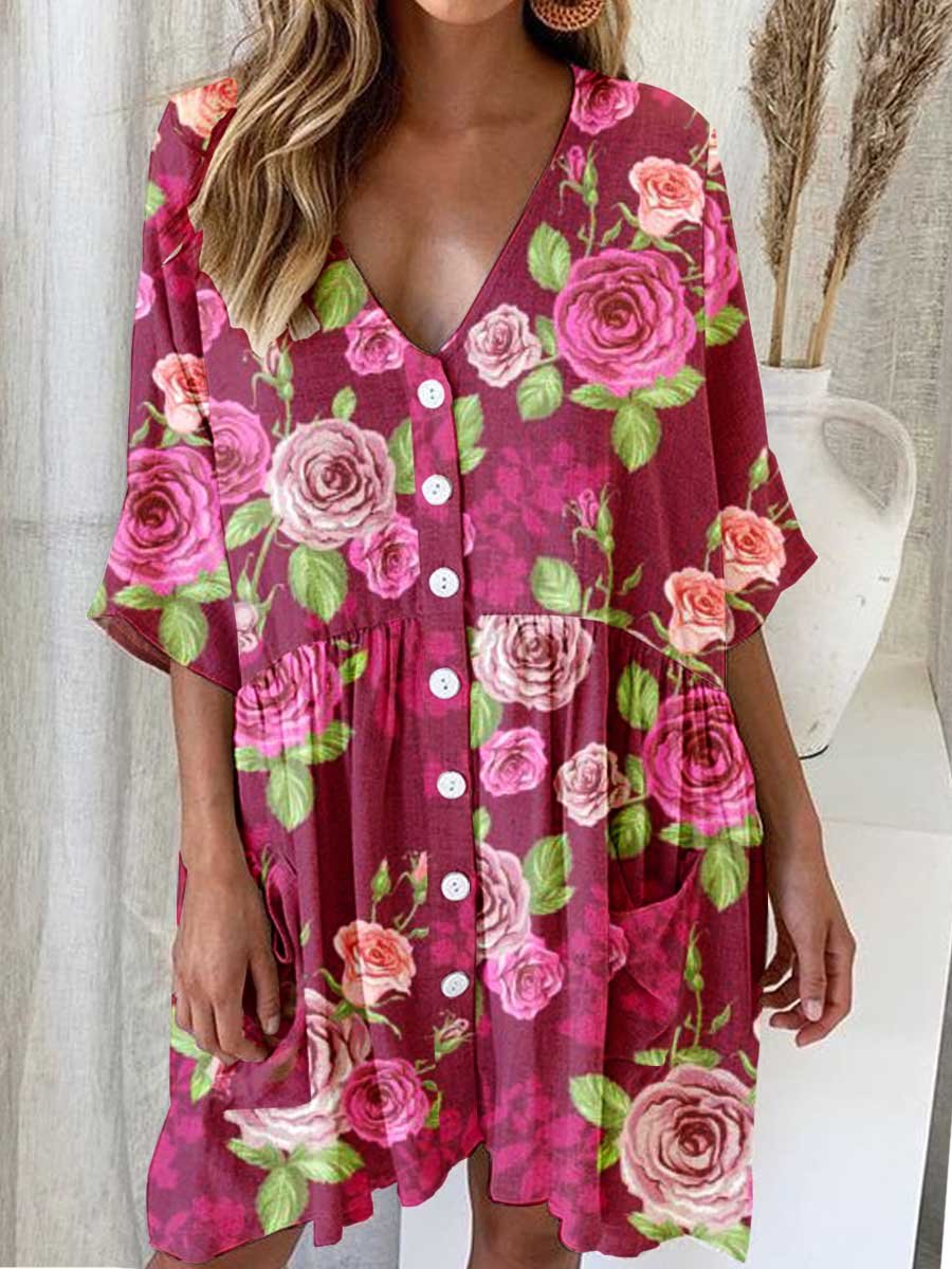 Women's Elegant Rose Floral Pattern V-Neck Cardigan Cotton and Linen Dress