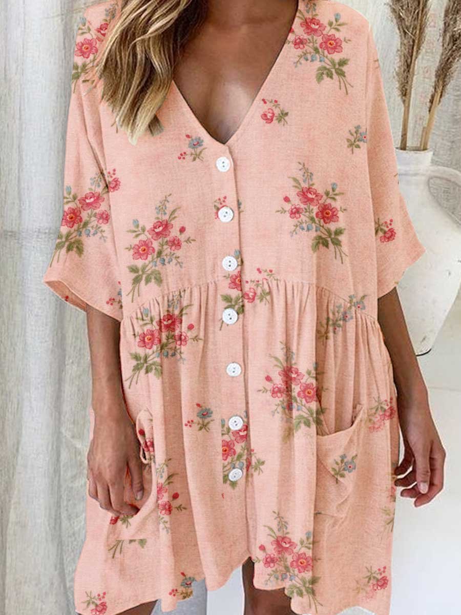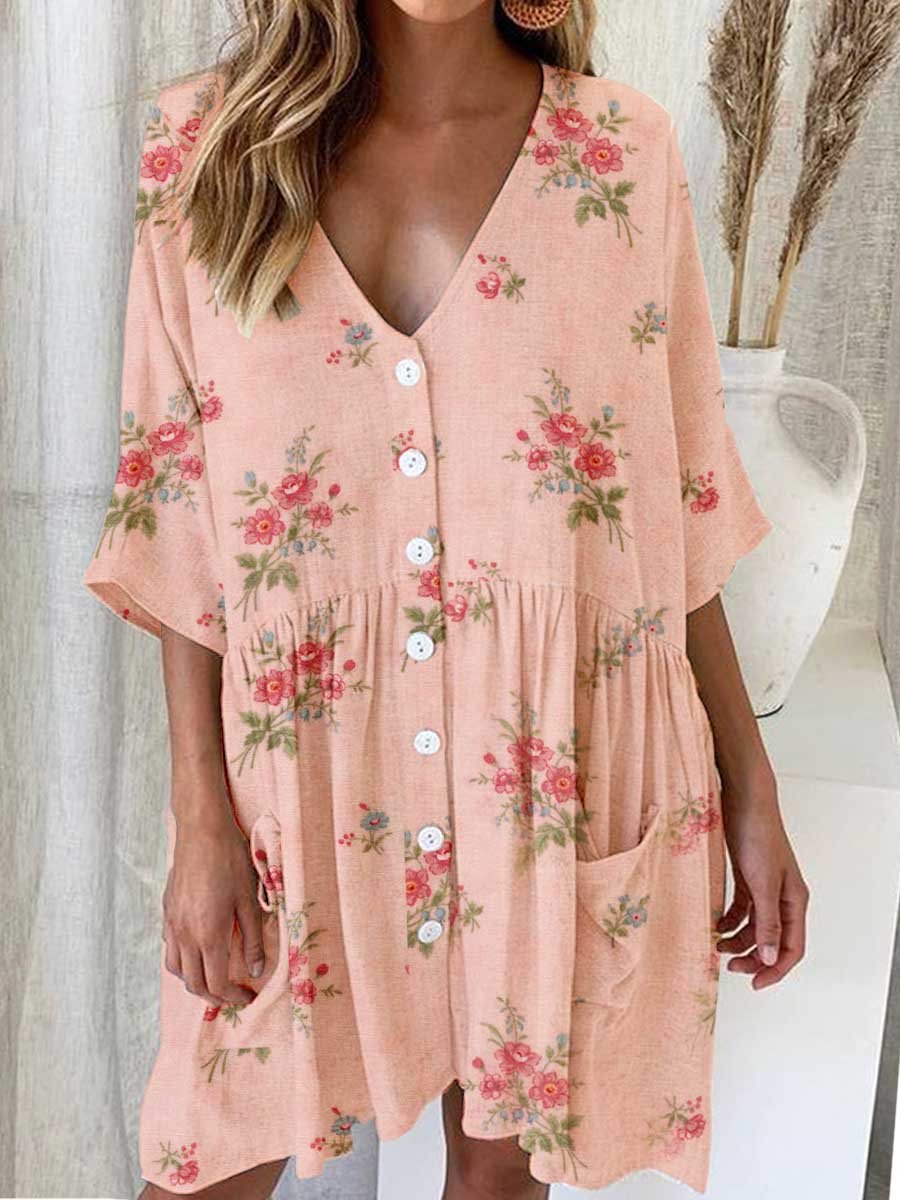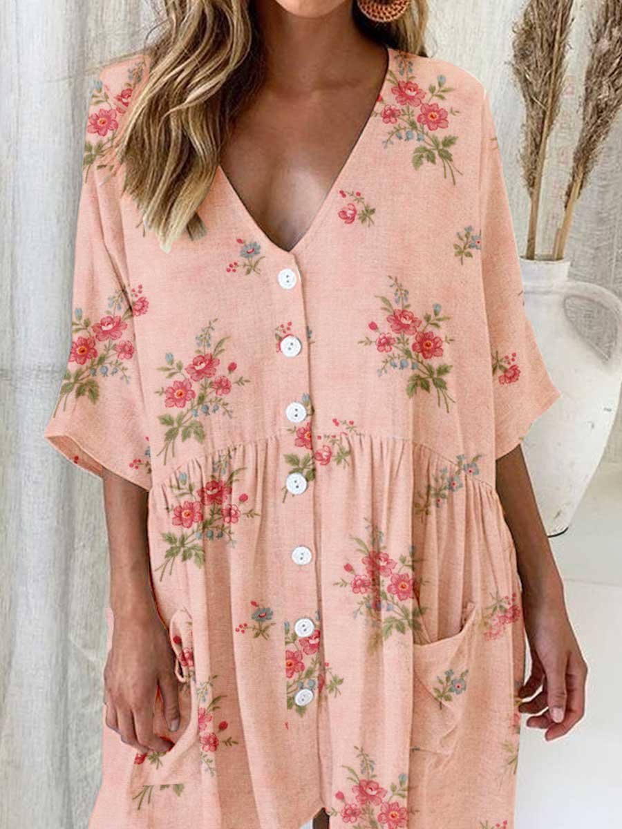Women's Elegant Rose Floral Pattern V-Neck Cardigan Cotton and Linen Dress