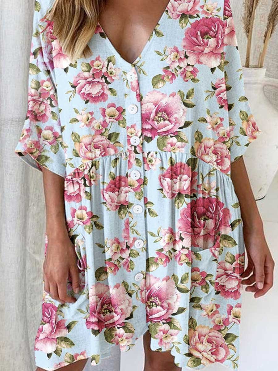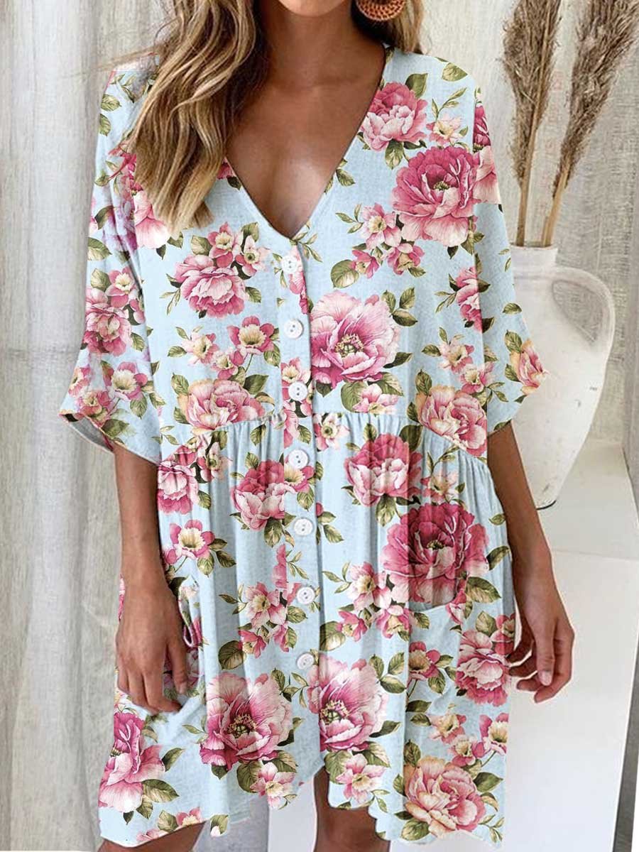 Women's Elegant Rose Floral Pattern V-Neck Cardigan Cotton and Linen Dress