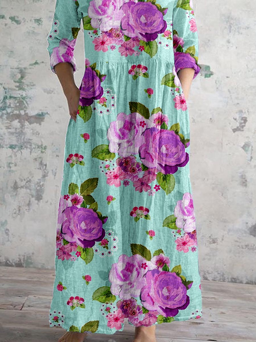 Women's Elegant Rose Floral Pattern V-Neck Cotton and Linen Dress with Pockets