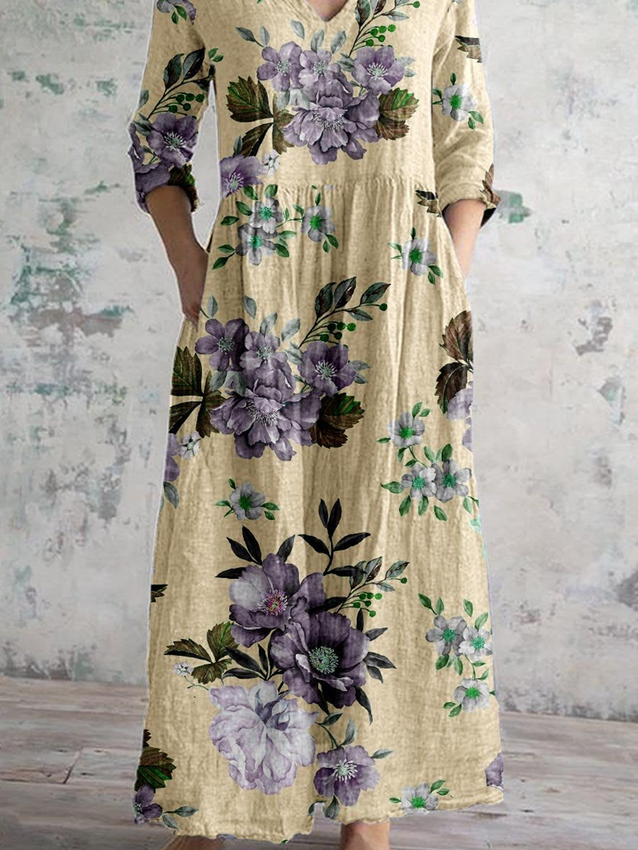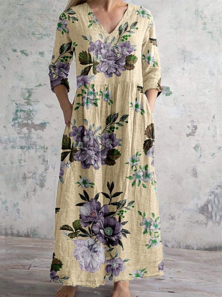 Women's Elegant Rose Floral Pattern V-Neck Cotton and Linen Dress with Pockets