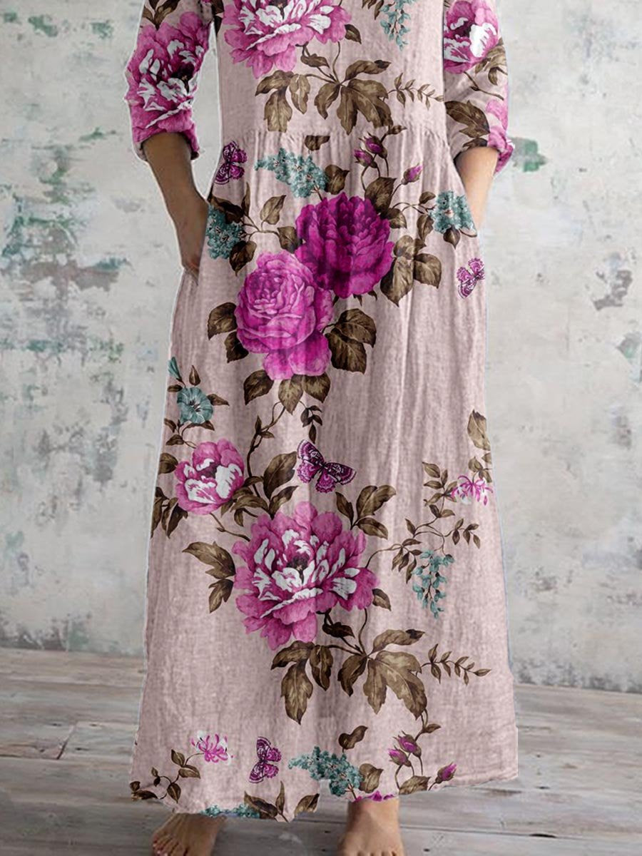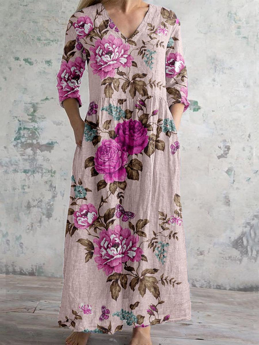 Women's Elegant Rose Floral Pattern V-Neck Cotton and Linen Dress with Pockets