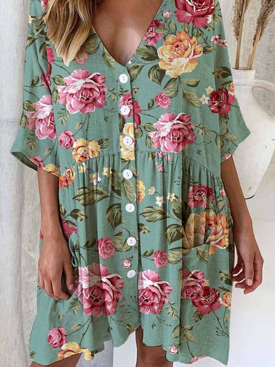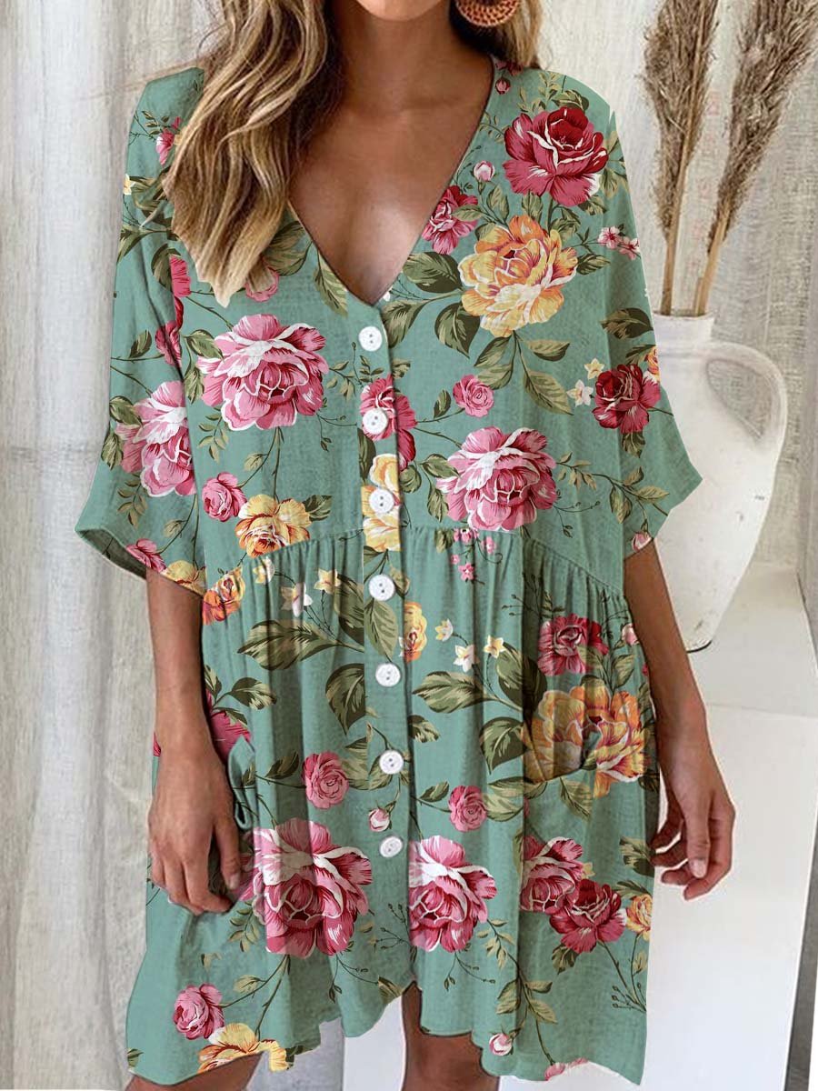 Women's Elegant Rose Floral Print Cotton and Linen Dress