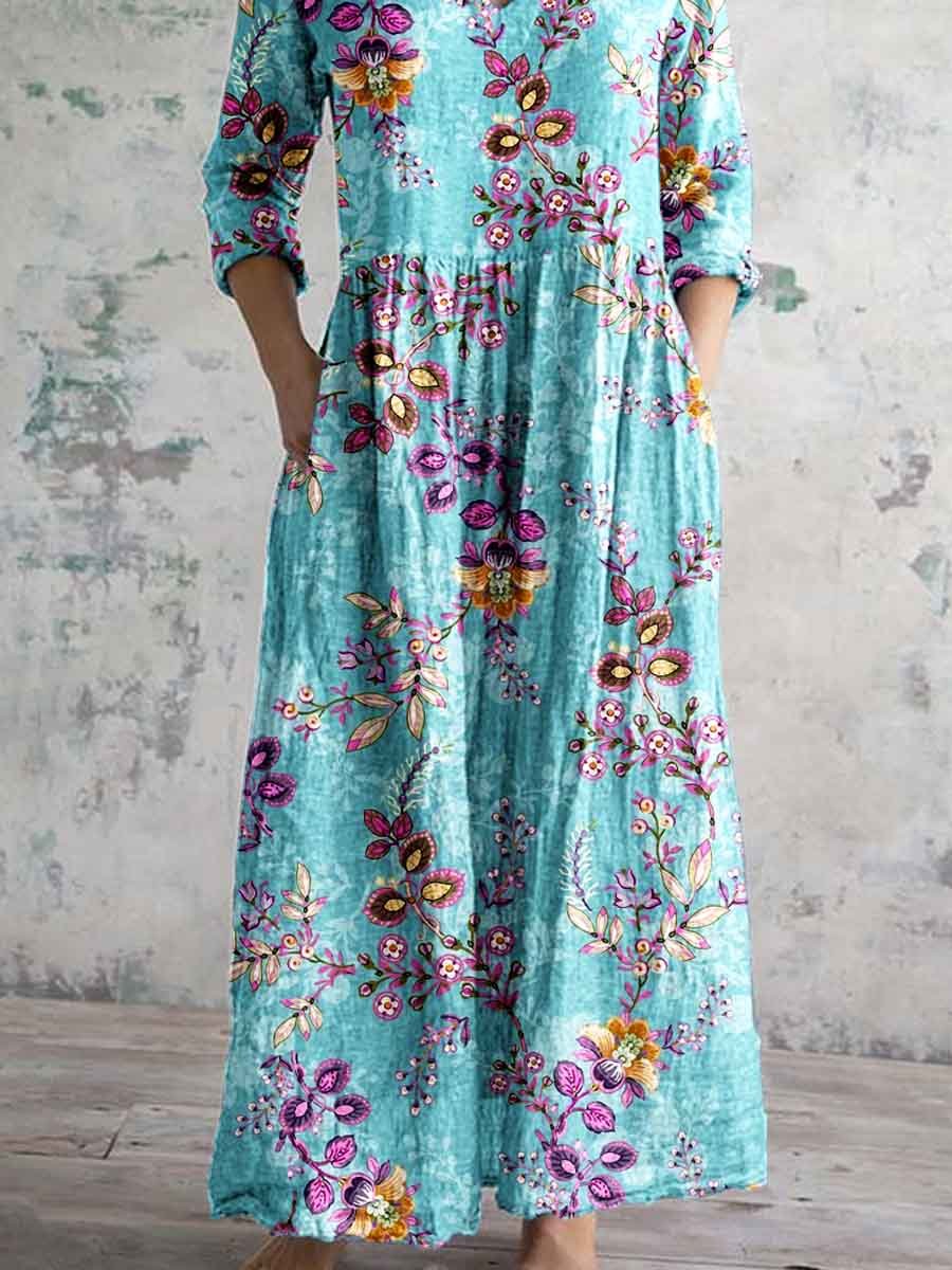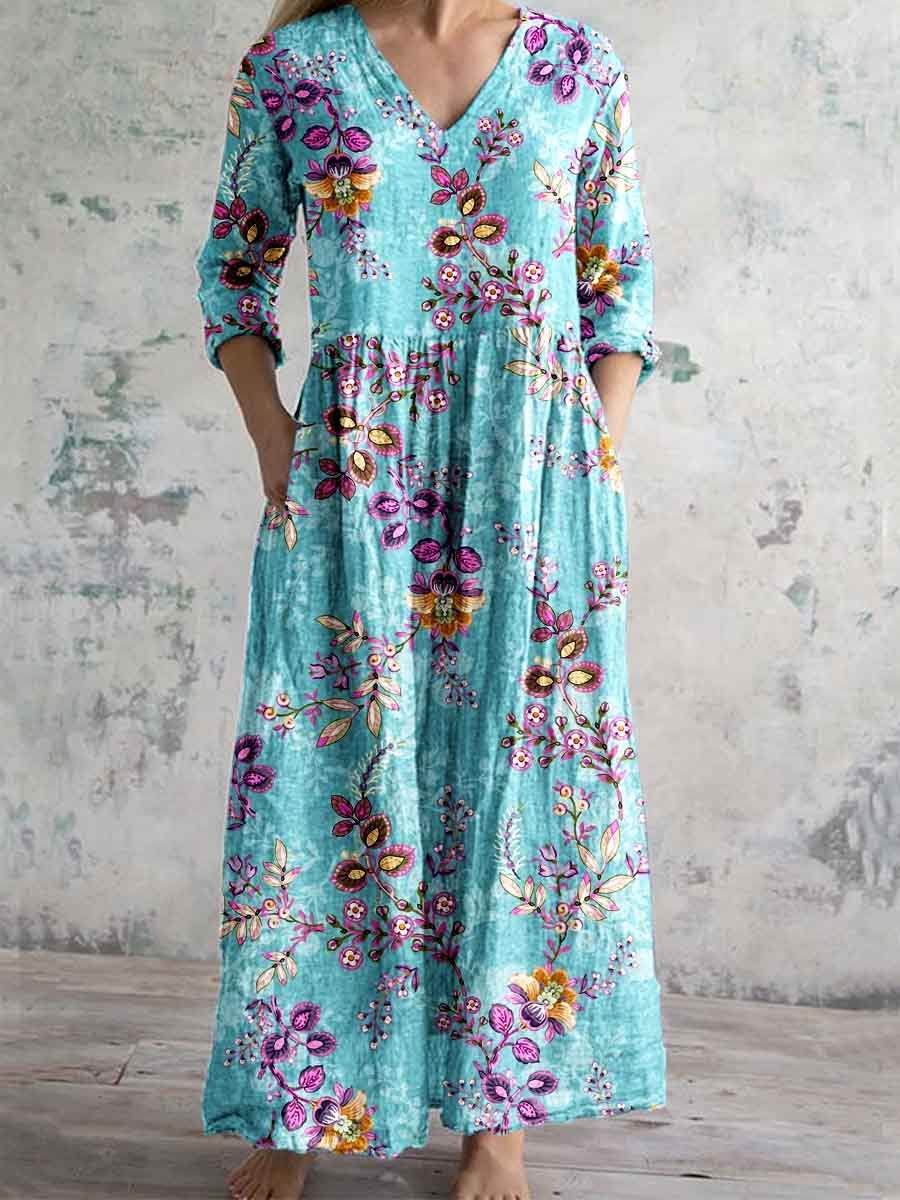 Women's Elegant Rose Floral Print V-Neck Cotton and Linen Dress with Pockets