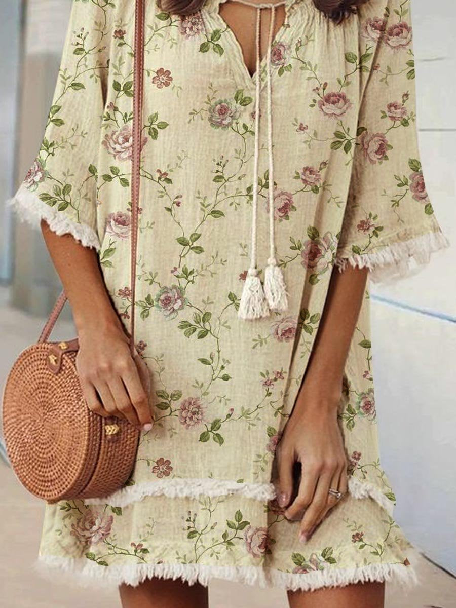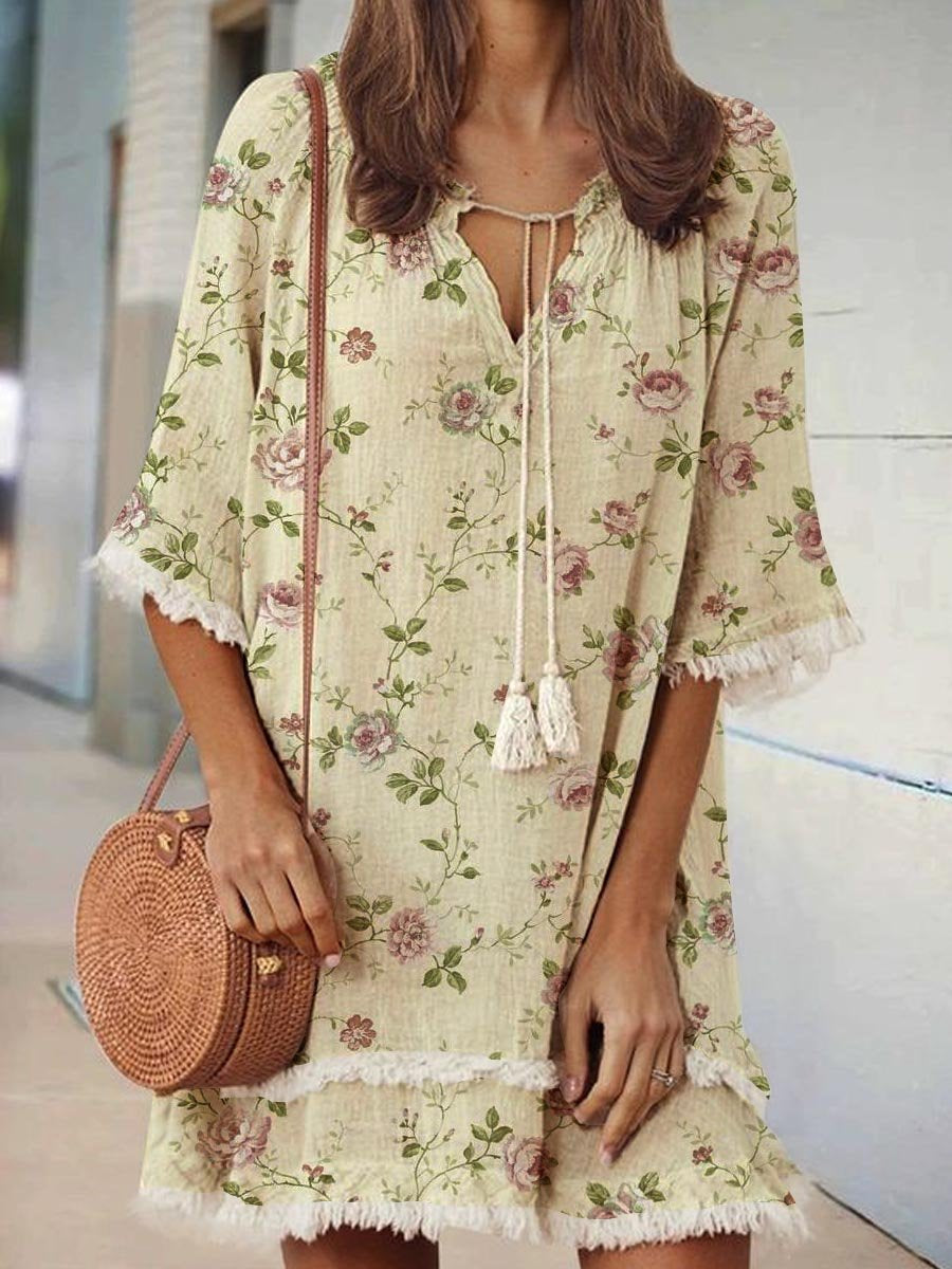 Women's Elegant Rose Floral Print V-Neck Strappy Raw Edge Cotton And Linen Dress