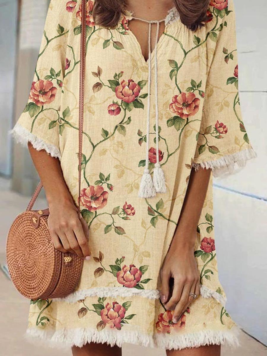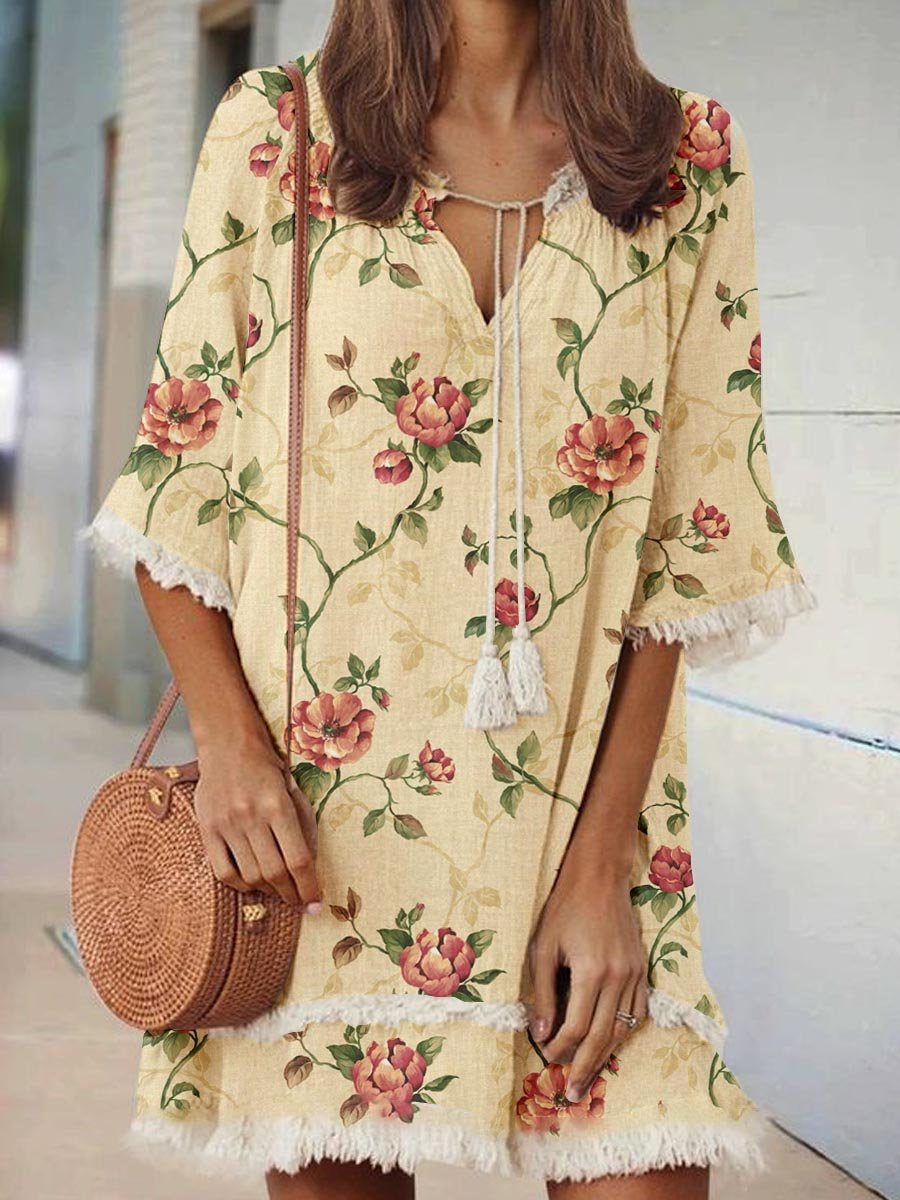 Women's Elegant Rose Floral Print V-Neck Strappy Raw Edge Cotton And Linen Dress