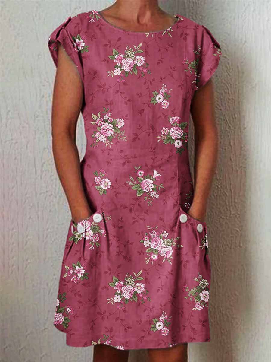 Women's Elegant Rose Rose Floral Pattern Cotton and Linen Dress with Pockets