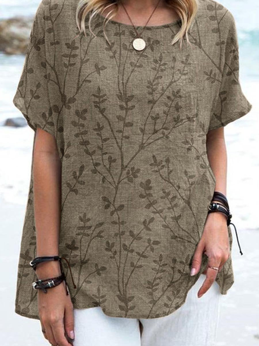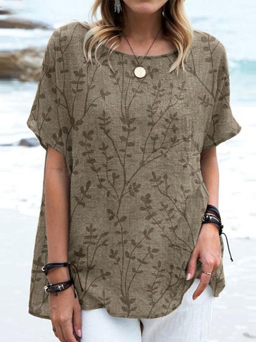 Women's Elegant Simple Decorative Floral Print Cotton And Linen Top