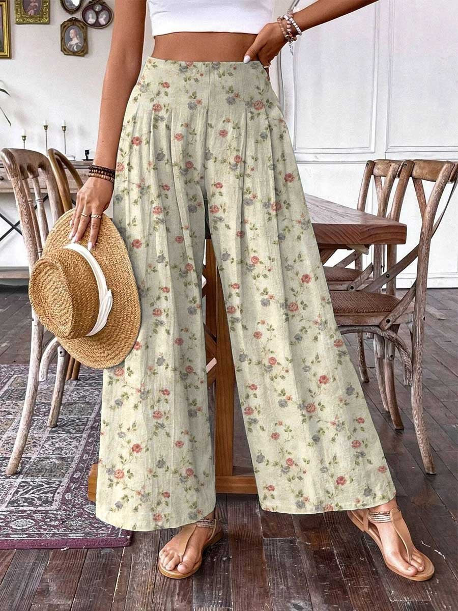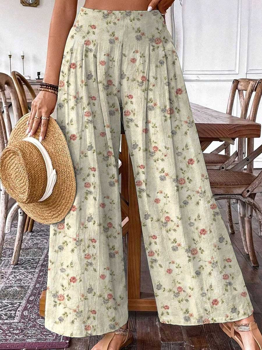 Women's Elegant Simple Floral Pattern Cotton and Linen Pants