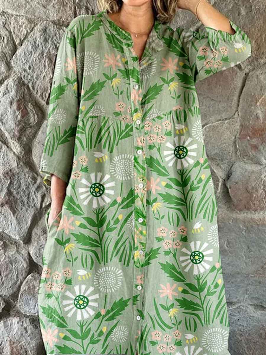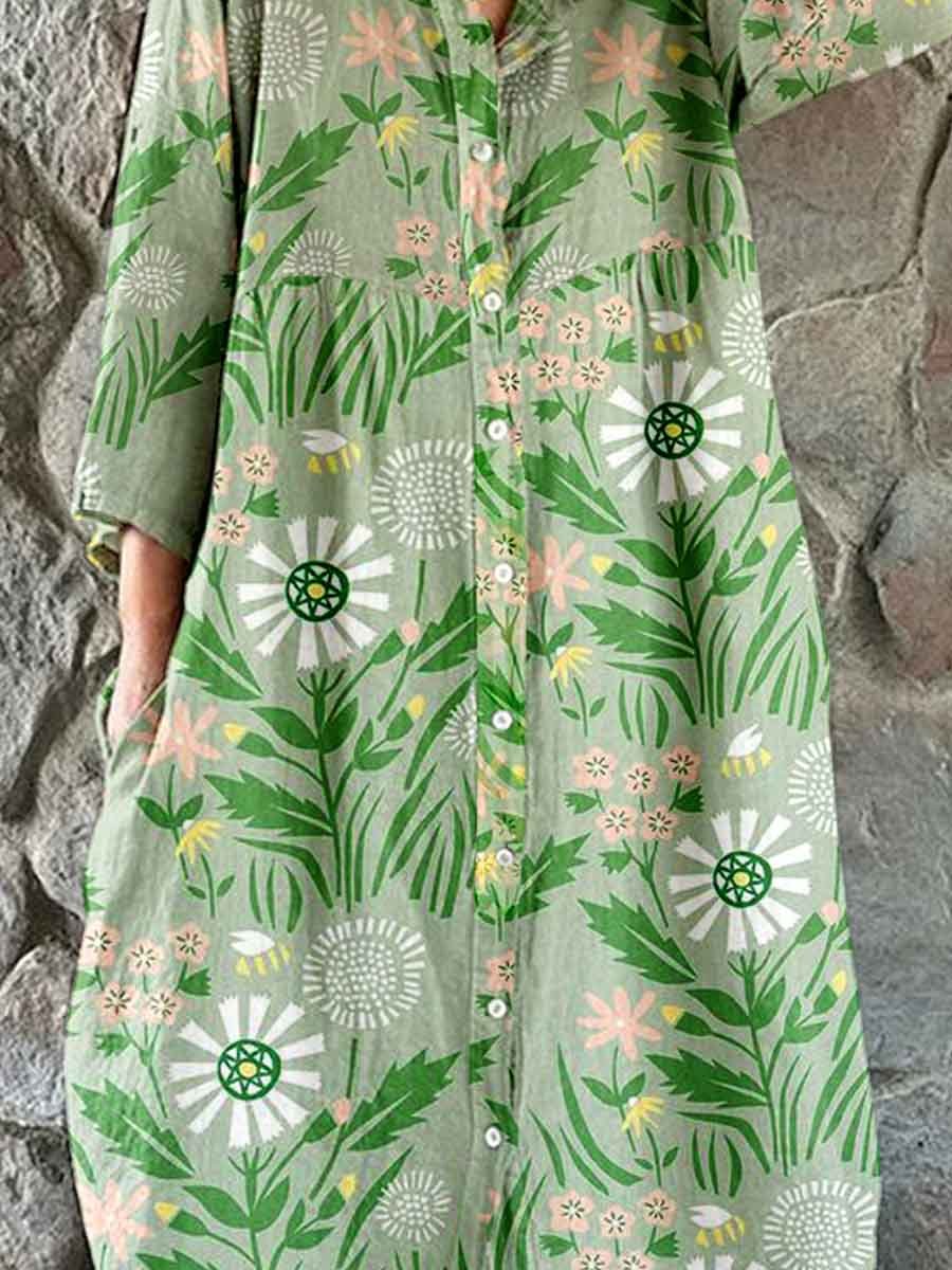 Women's Elegant Simple Floral Pattern Shirt Style Cotton and Linen Dress