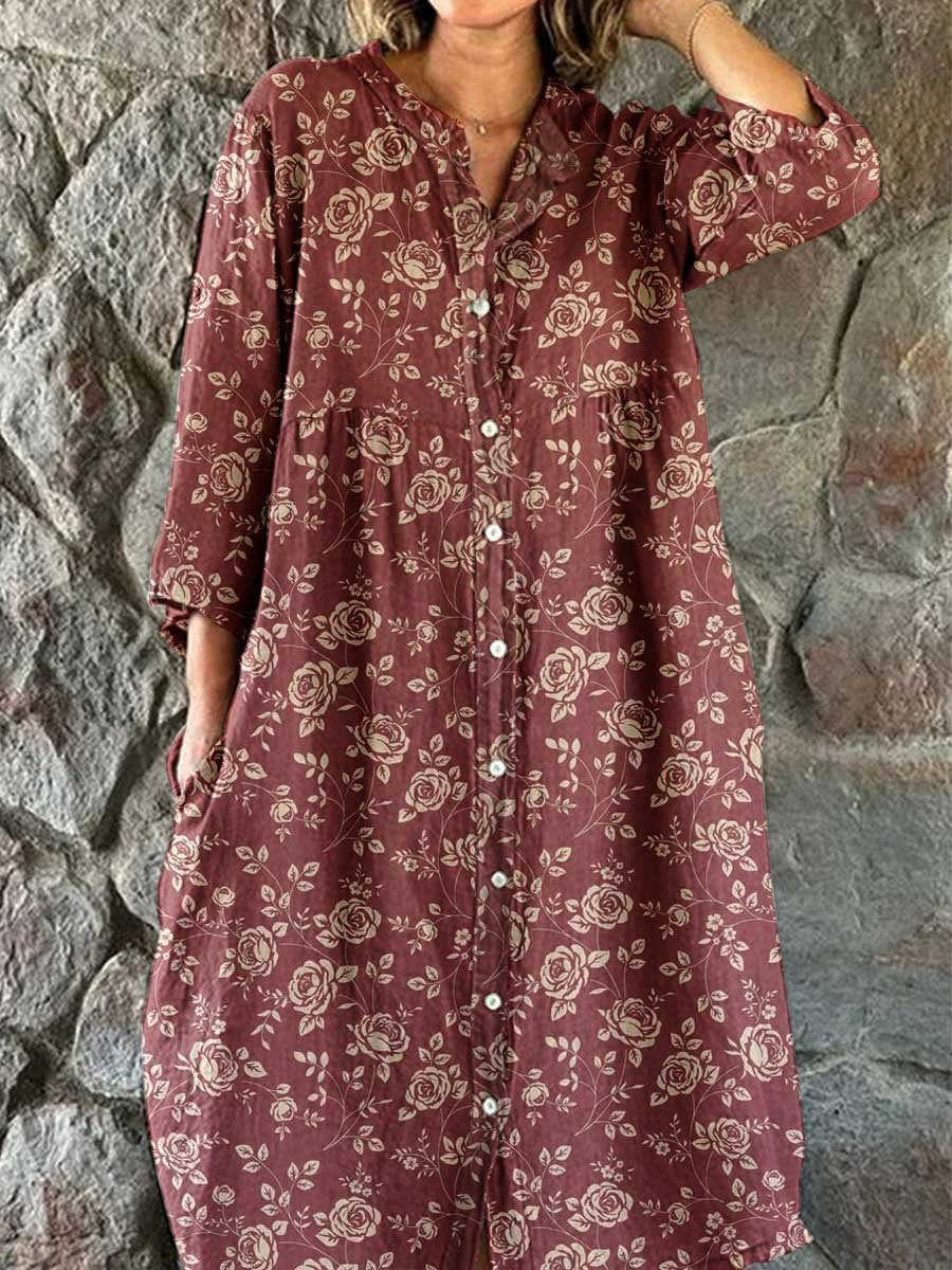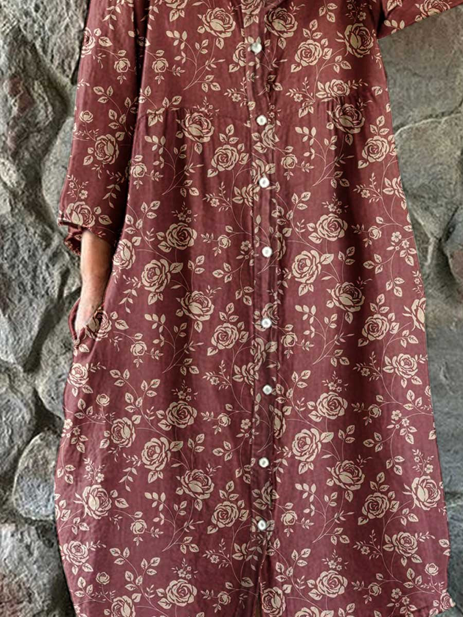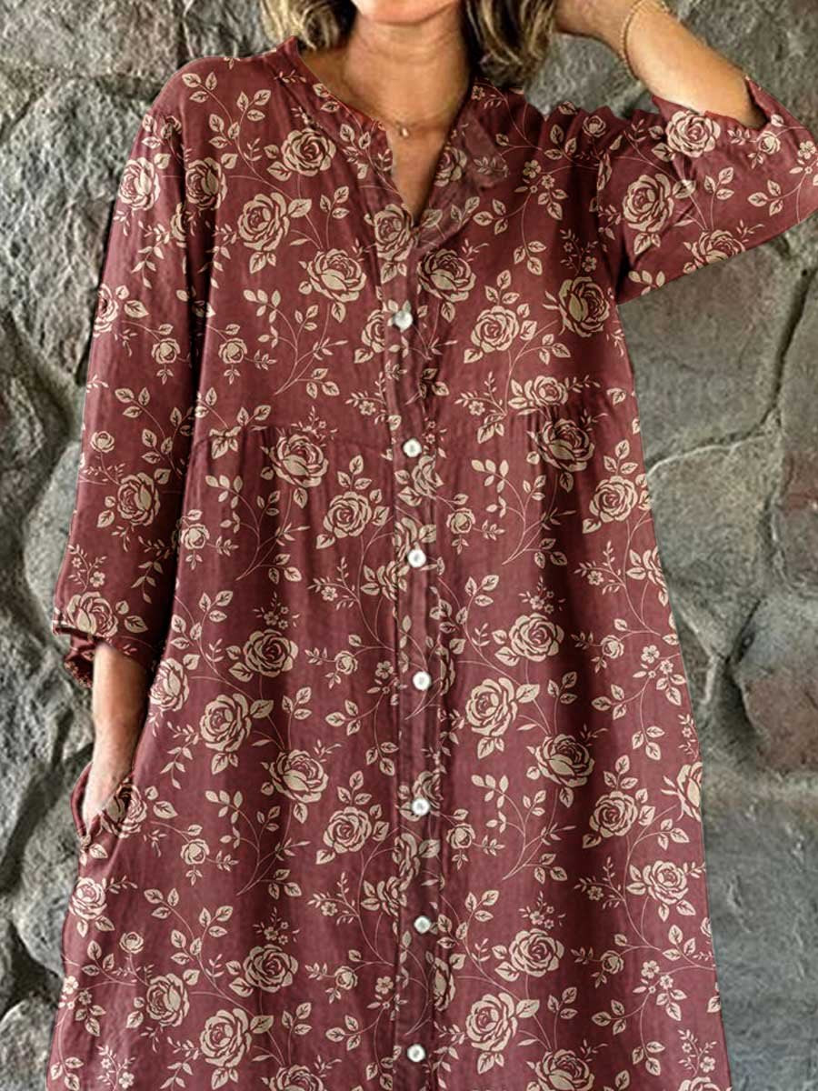 Women's Elegant Simple Rose Floral Stripe Pattern Cotton and Linen Shirt Dress