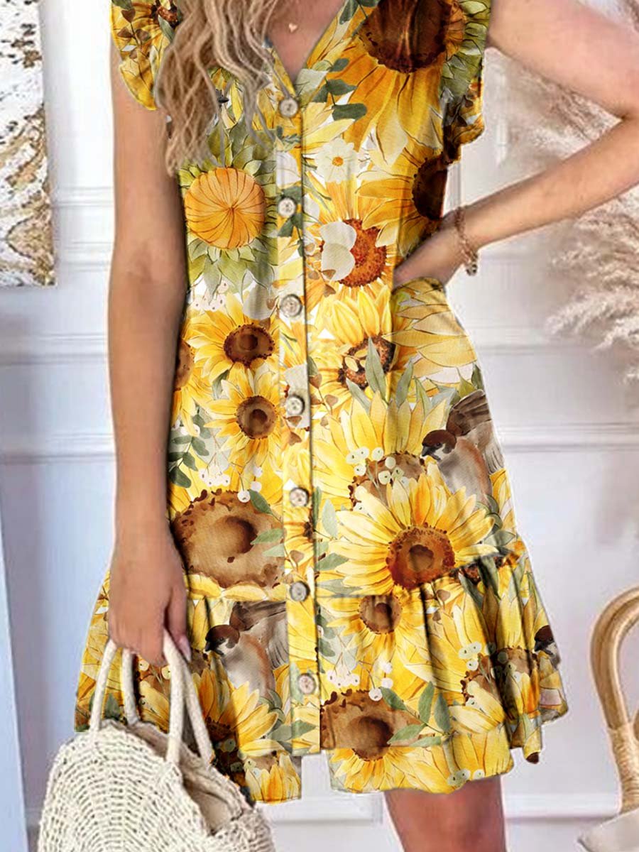 Women's Elegant Sunflower Floral Pattern Graphic Ruffle Sleeve Hem Dress