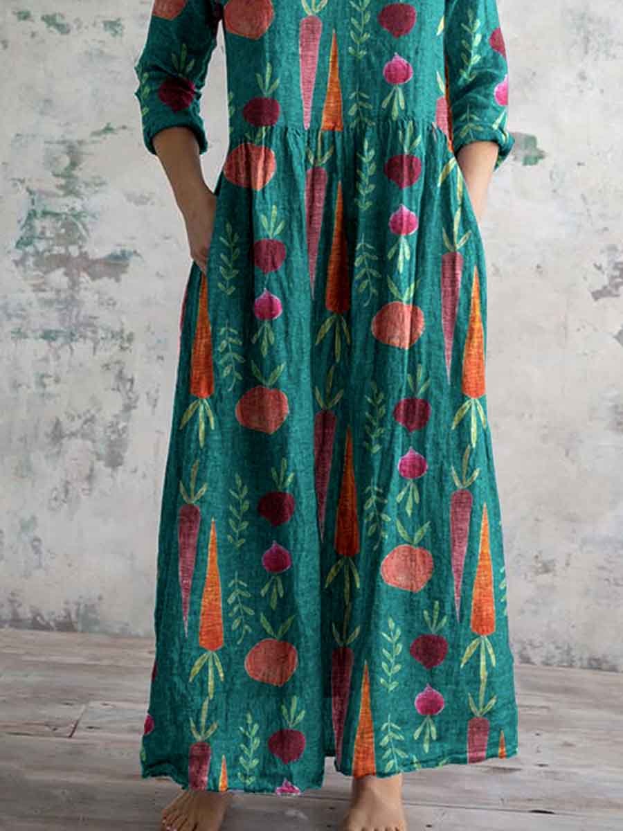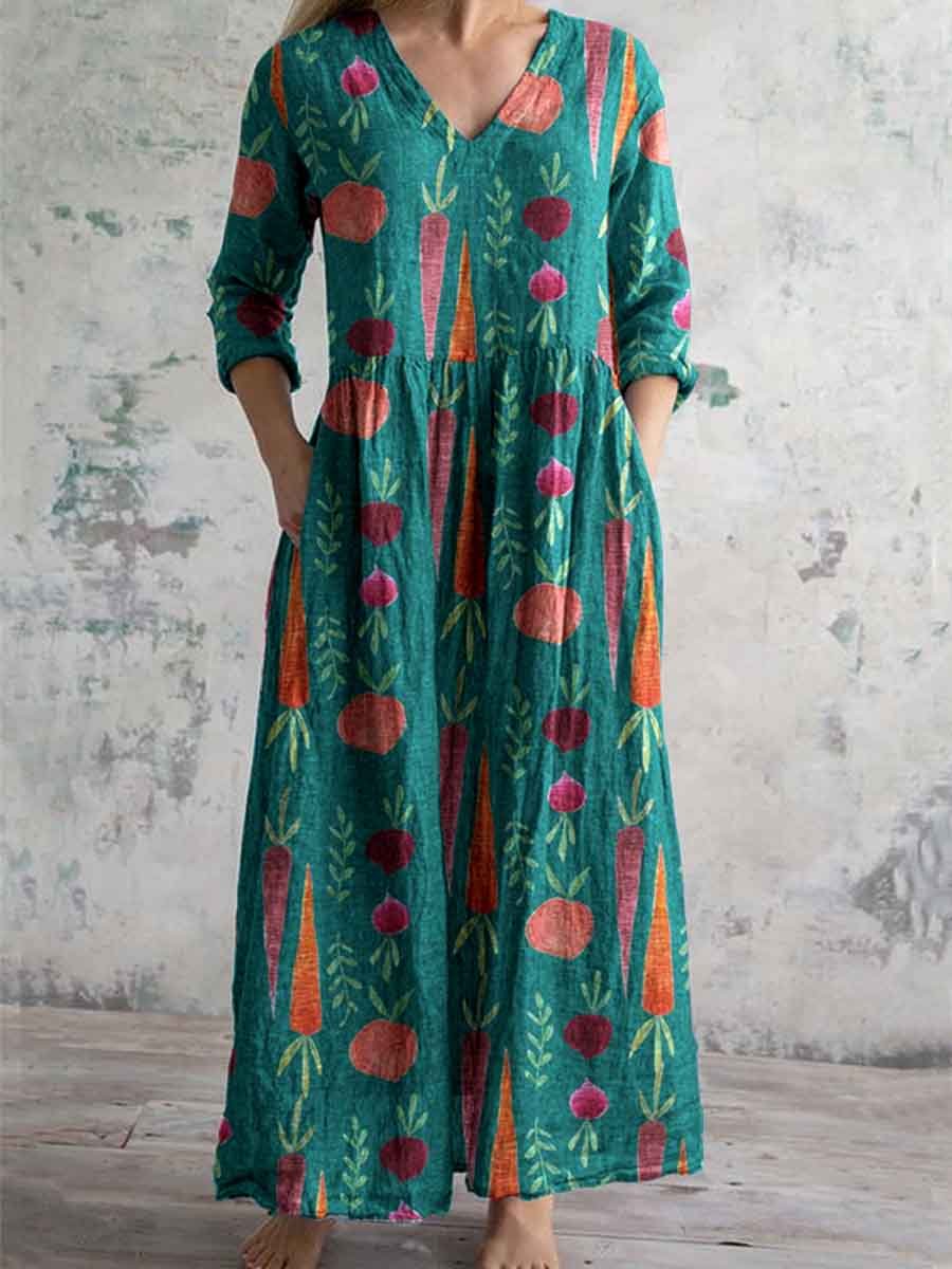 Women's Elegant Vegetable Carrot Pattern V-Neck Cotton and Linen Dress