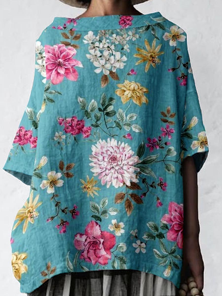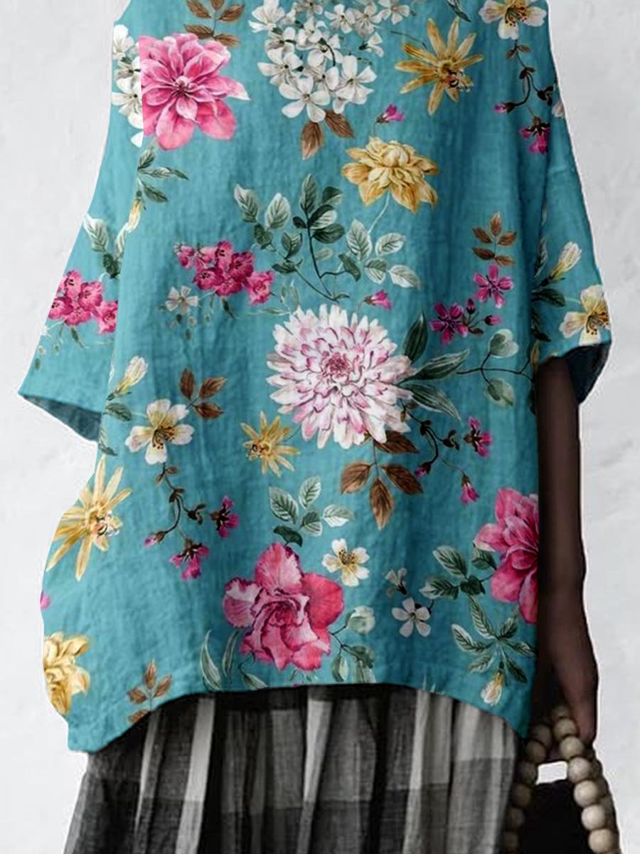 Women's Elegant Vintage Floral Pattern Cotton and Linen Top