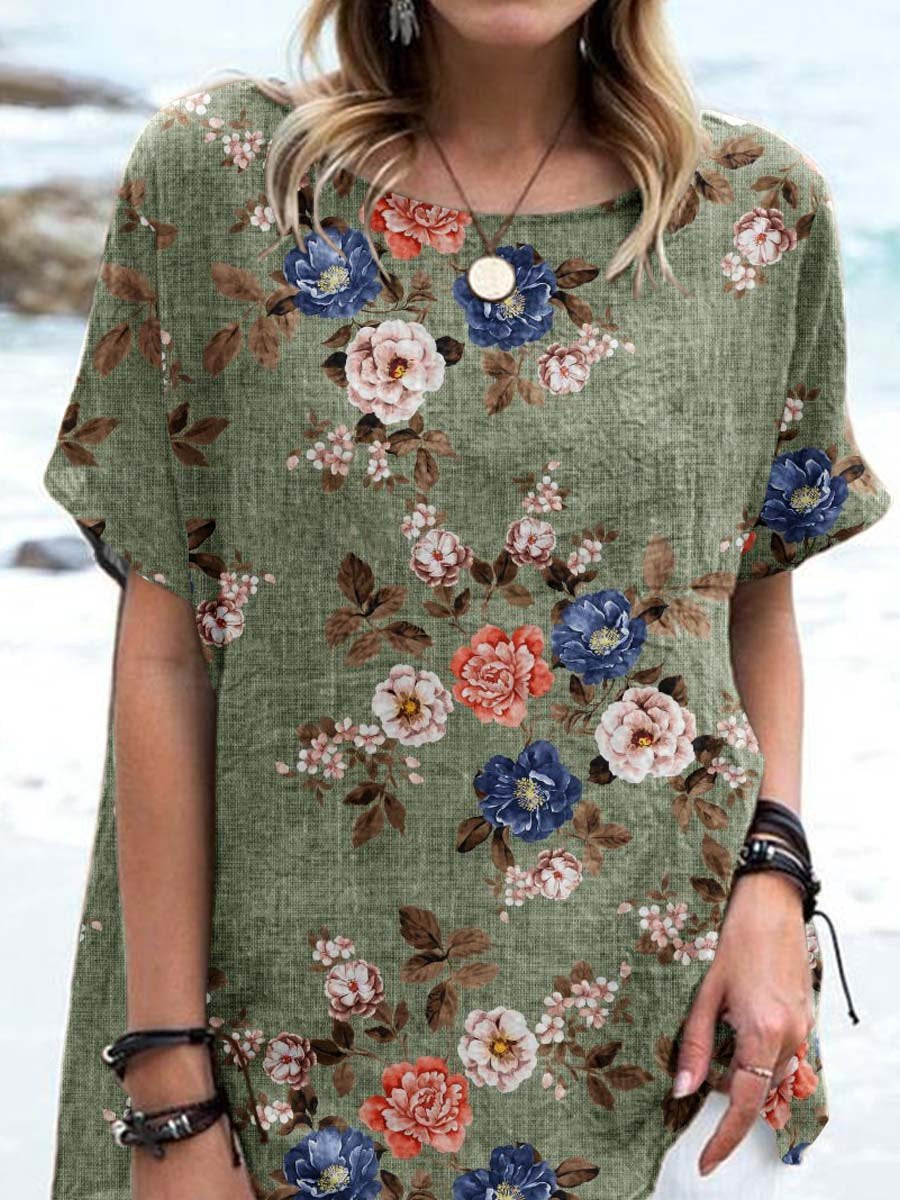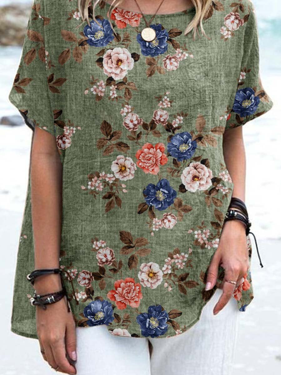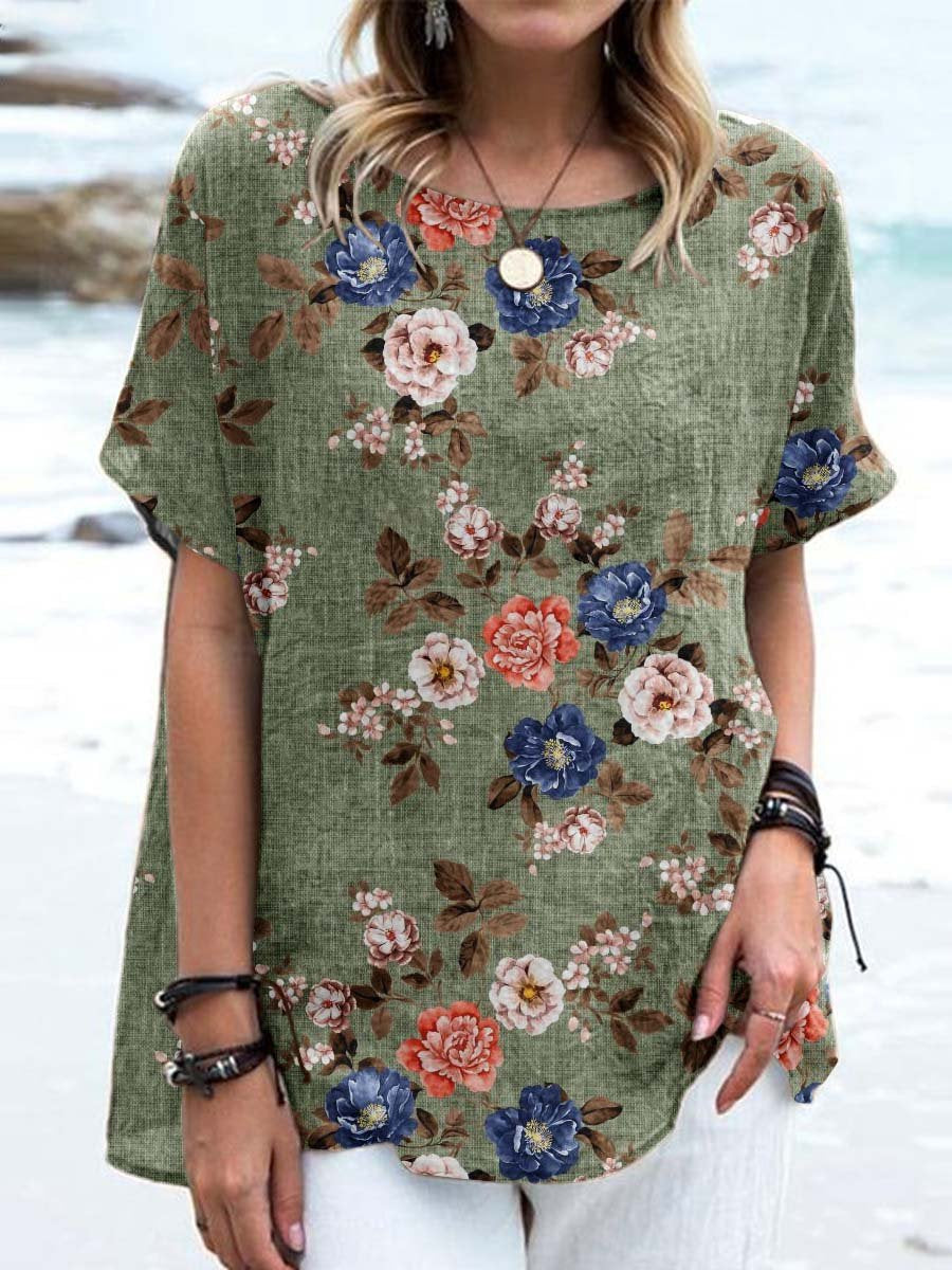 Women's Elegant Vintage Floral Print Cotton and Linen Top