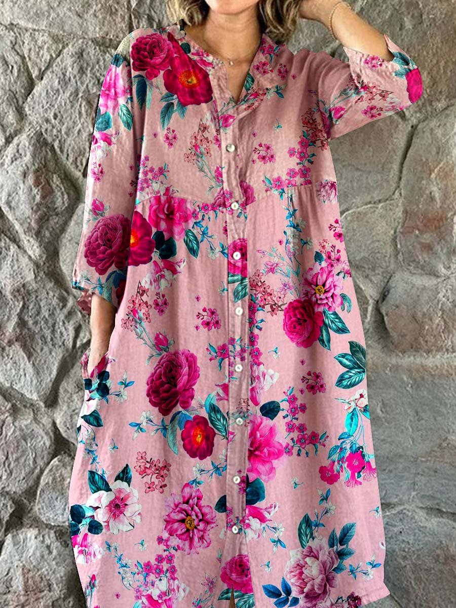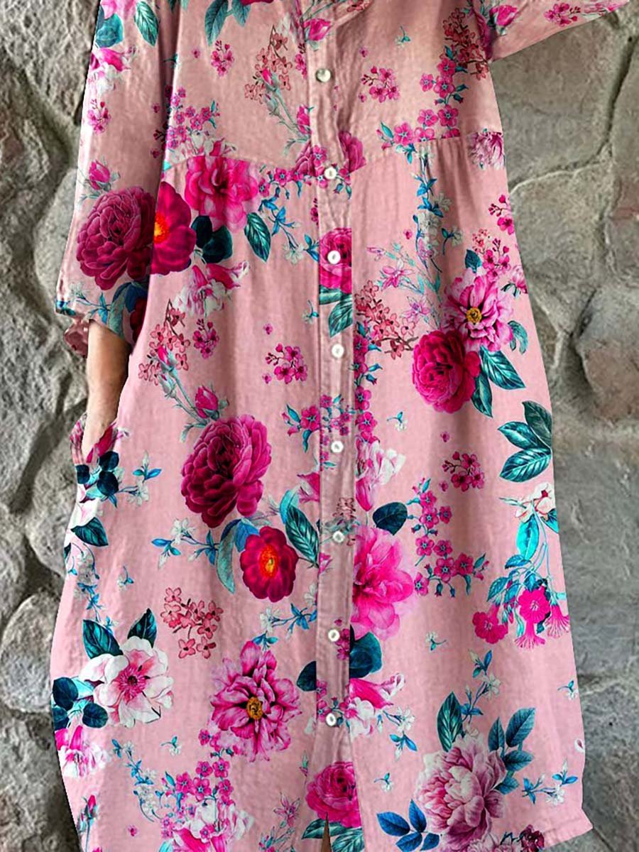 Women's Floral Art Print Cotton And Linen Shirt Dress