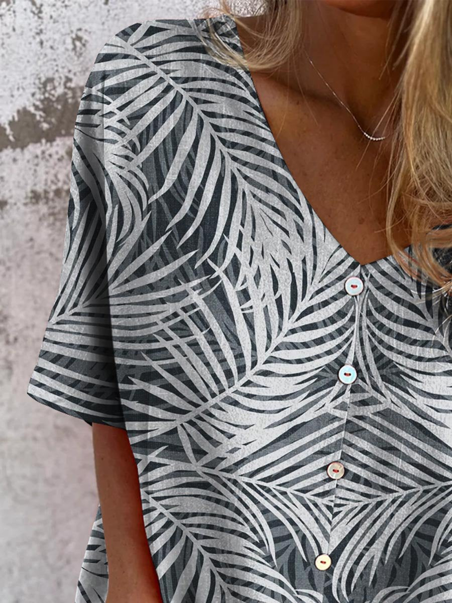 Women's Floral Art Printing Casual Cotton V-neck Top