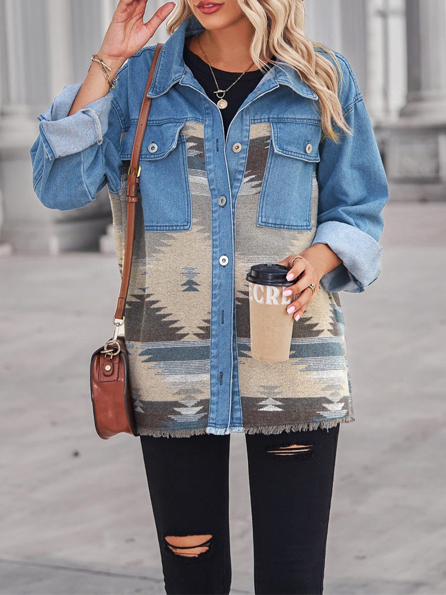 Women's Geometric Pattern Long Loose Denim Paneled Top