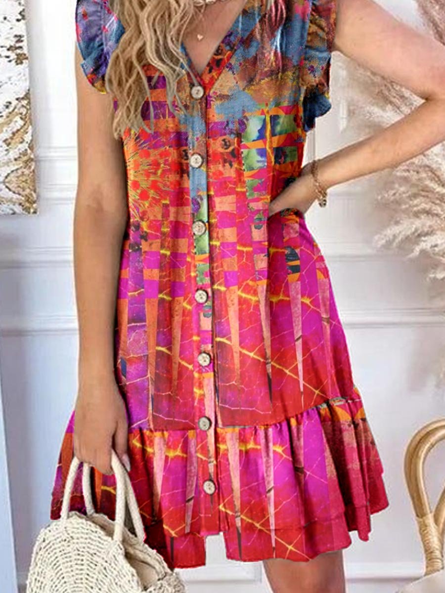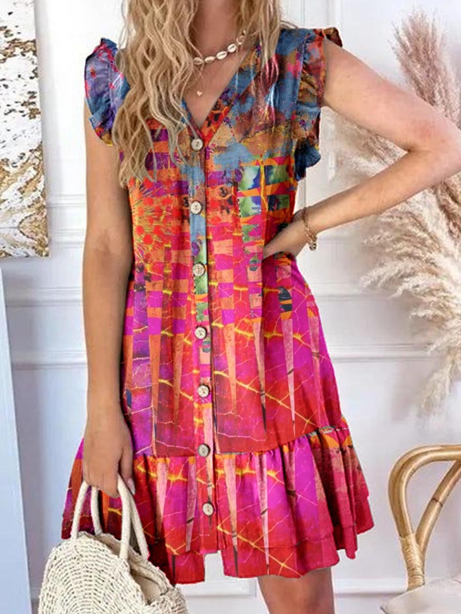 Women's Retro Art Geometric Pattern Ruffle Hem Sleeves Cotton and Linen Dress