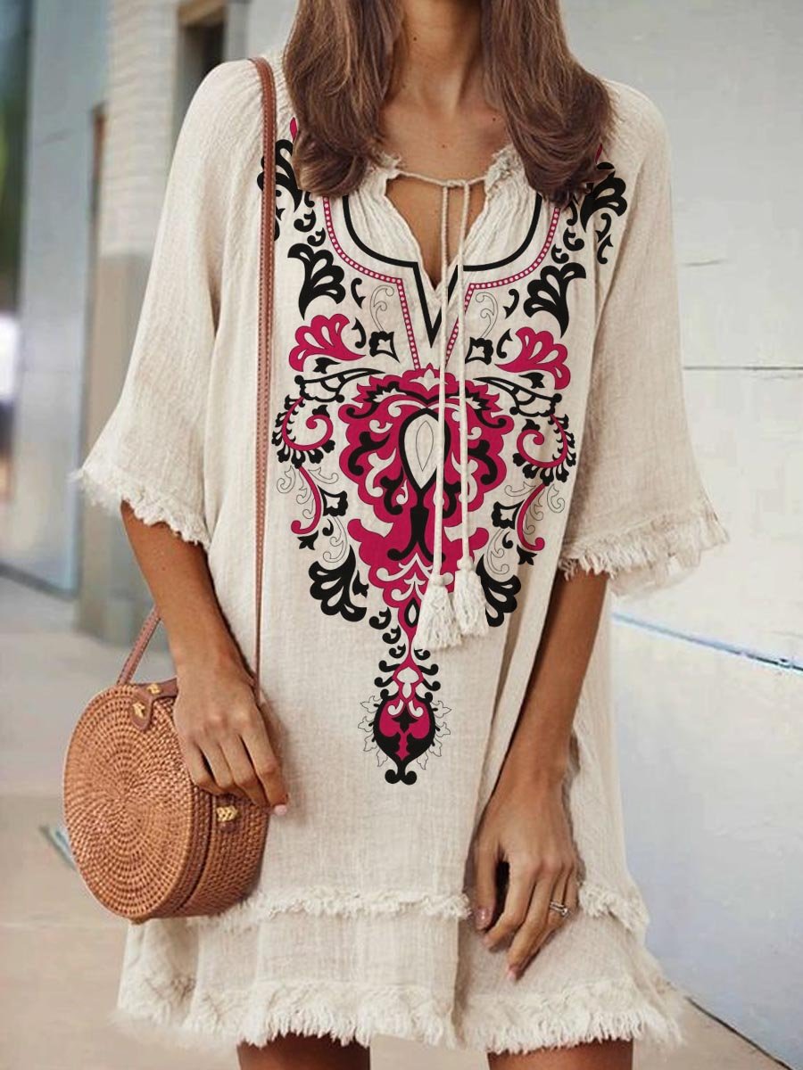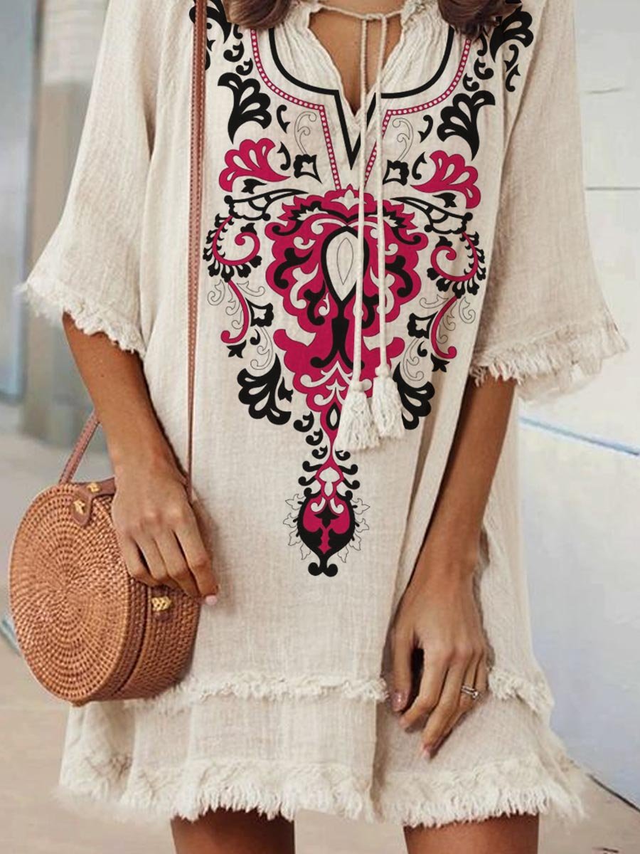 Women's Retro Bohemian Pattern Print V-Neck Strappy Raw Edge Cotton and Linen Dress