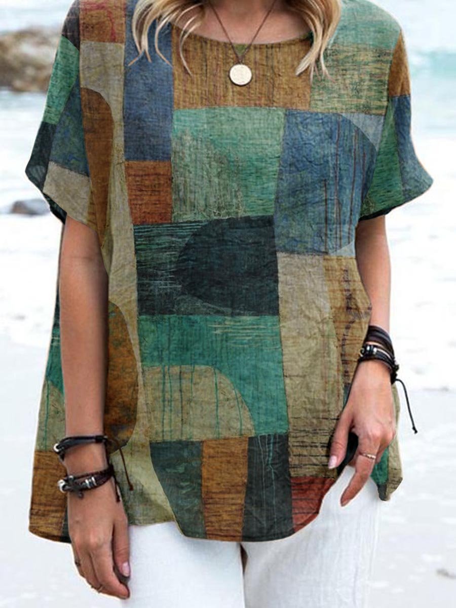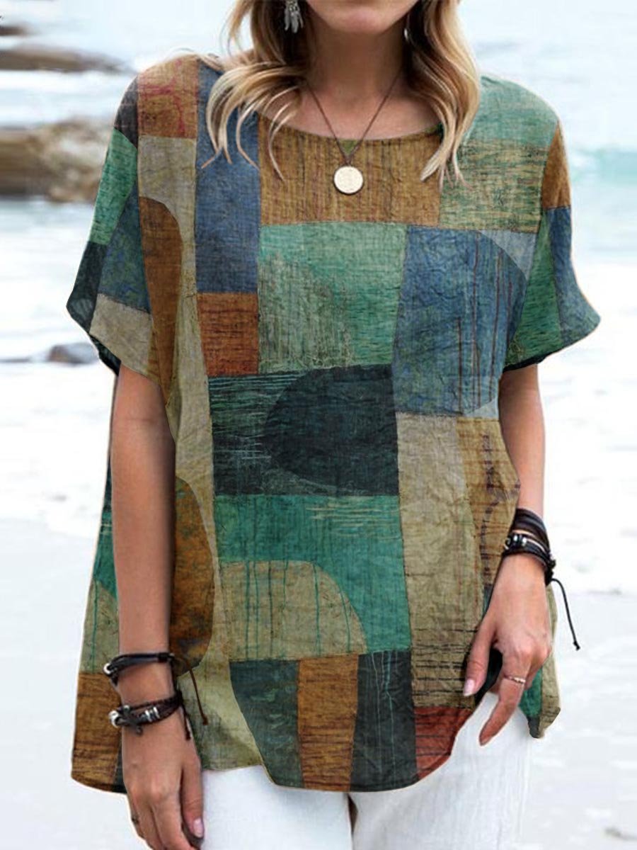 Women's Retro Elegant Geometric Pattern Cotton And Linen Top