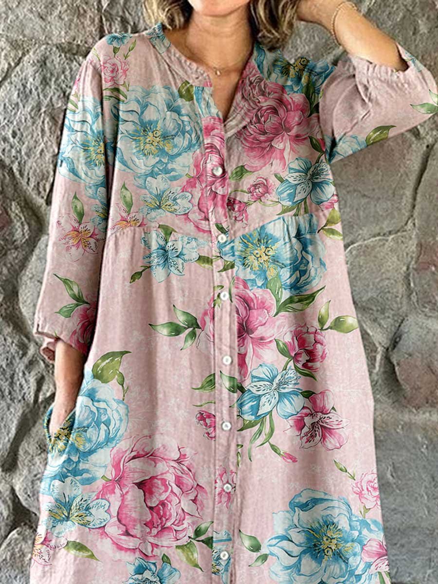 Women's Rose Floral Art Print Cotton and Linen Shirt Dress