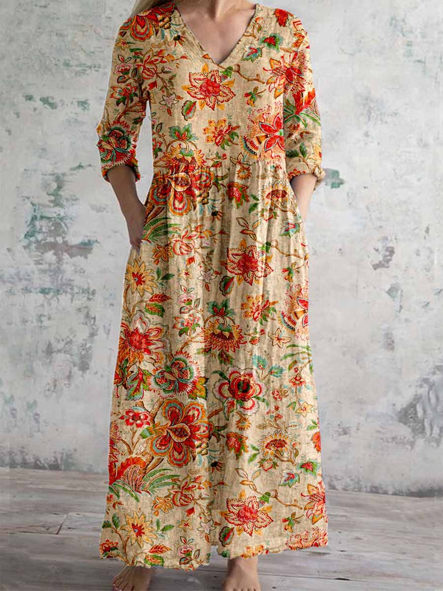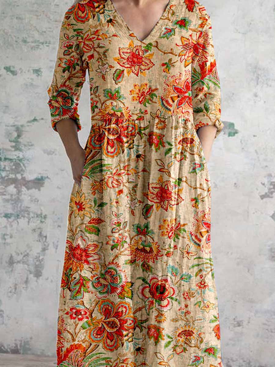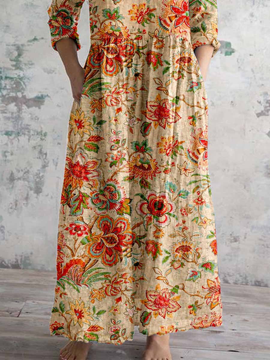 Women's Rose Floral Pattern Cotton And Linen Dress