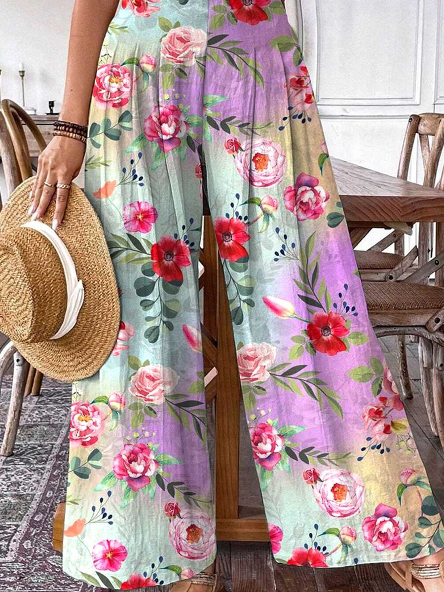 Women's Rose Floral Pattern Cotton and Linen Pants