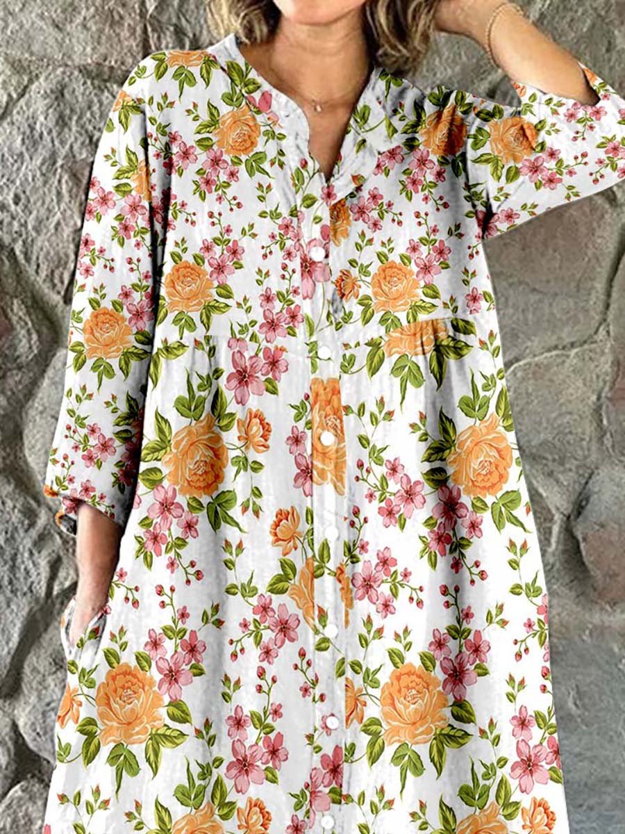 Women's Rose Flower Print Elegant Simple Shirt Cotton Linen Dress