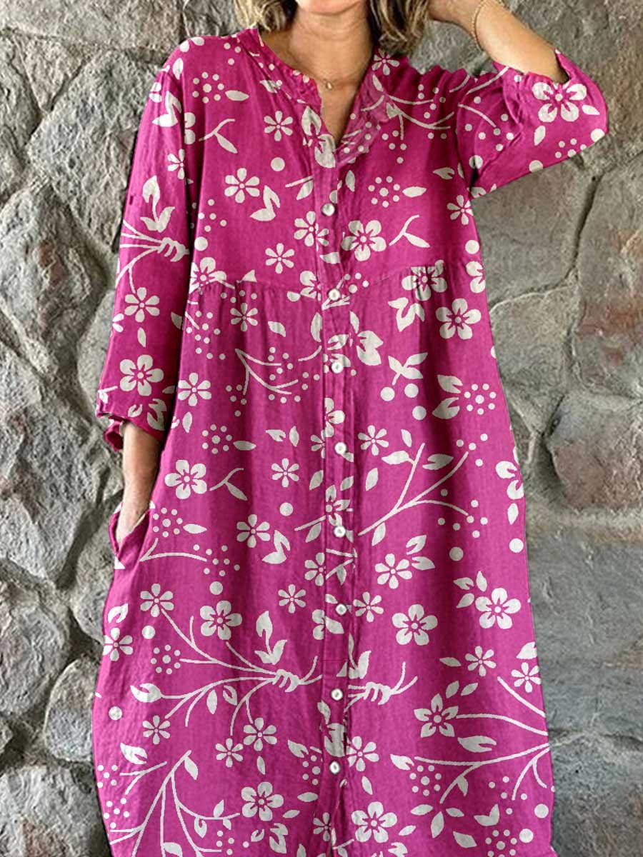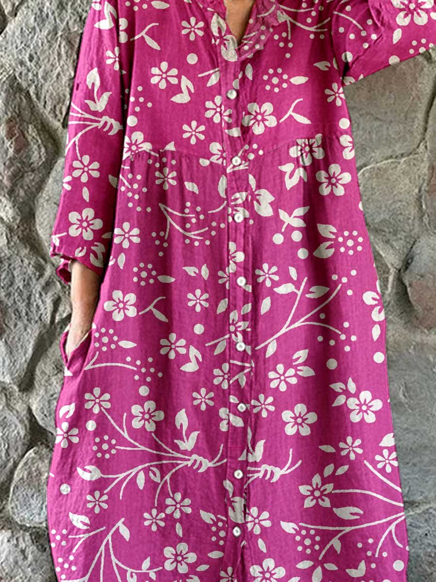 Women's Simple Elegant Decorative Floral Pattern Cotton and Linen Shirt Dress