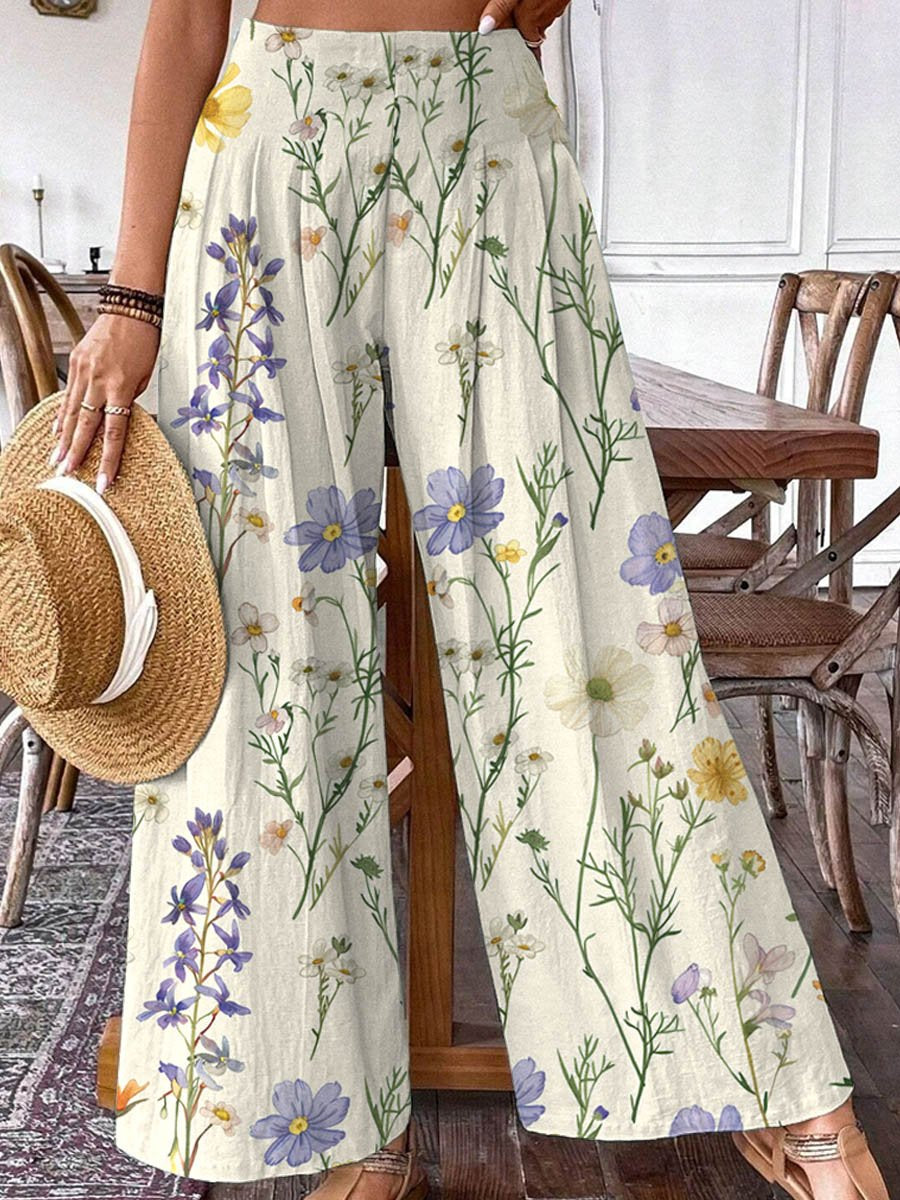 Women's Simple Elegant Floral Print Pattern Cotton Wide Leg Pants
