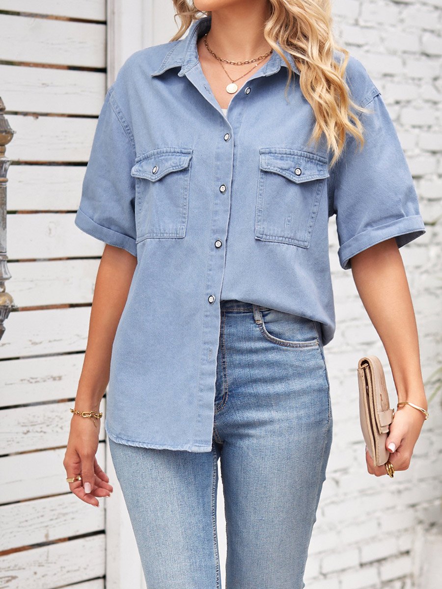 Women's Single Breasted Short Sleeve Denim Shirt