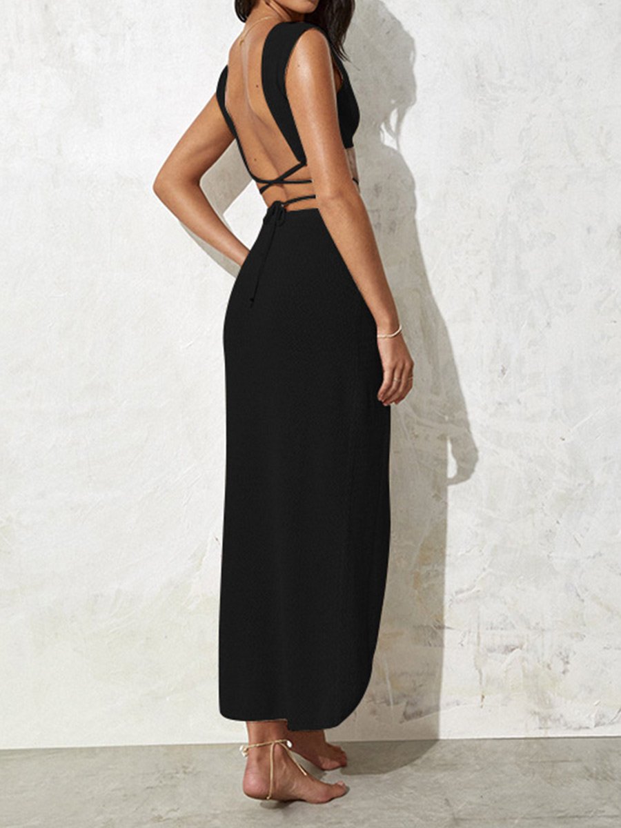 Women's Solid Color Strap Bikini Swimsuit Beach Skirt Set