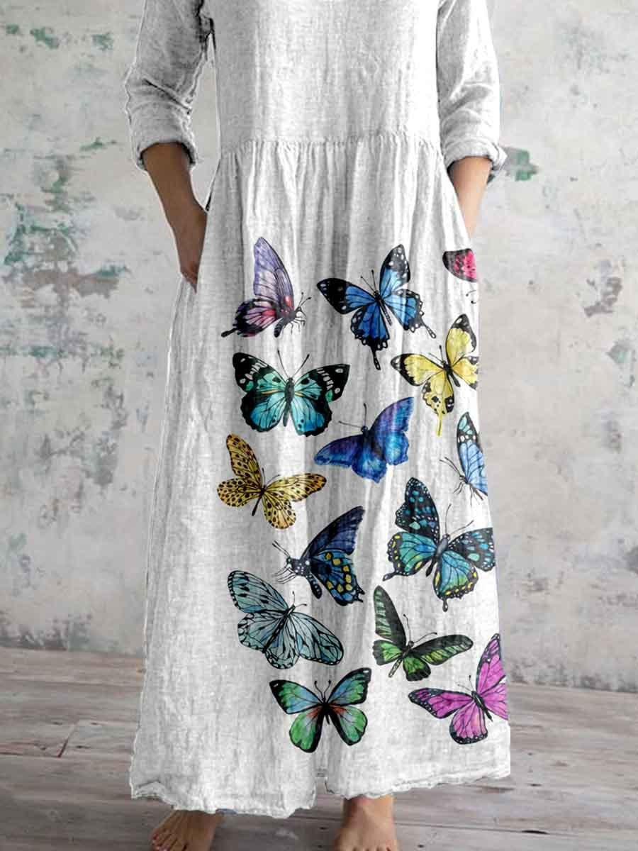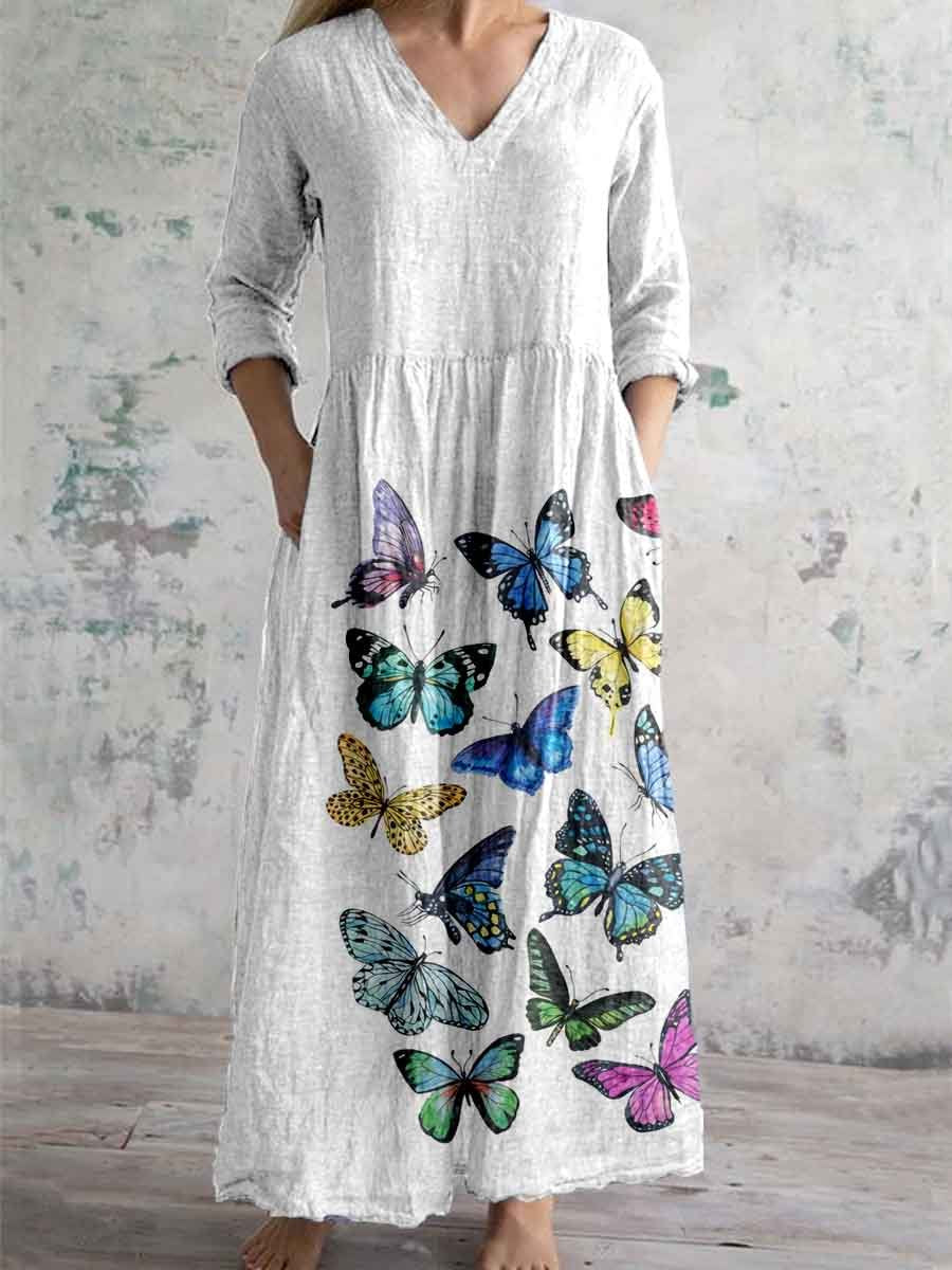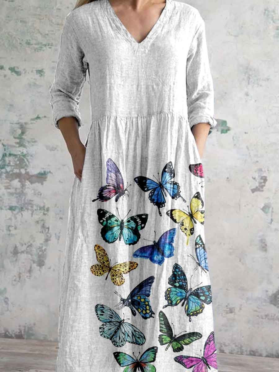 Women's Summer Butterfly Pattern Cotton And Linen Dress