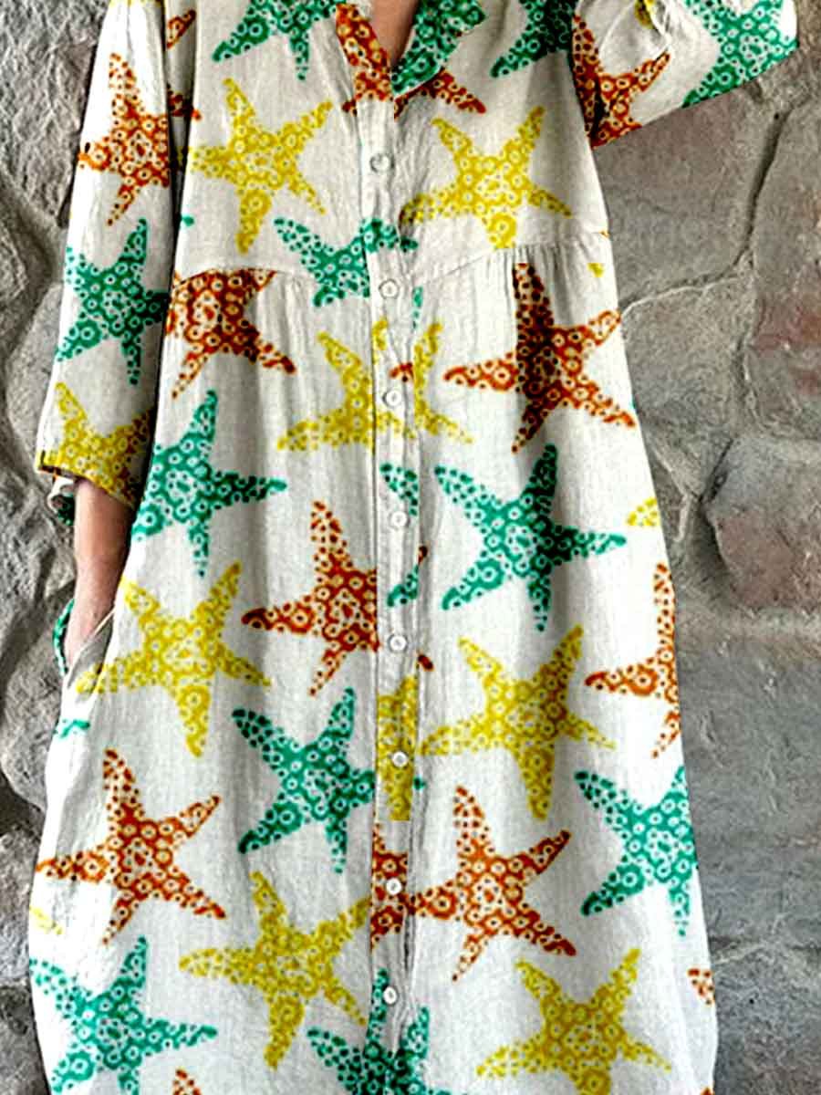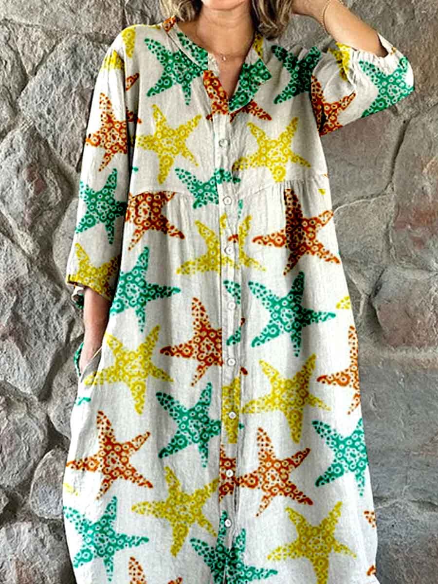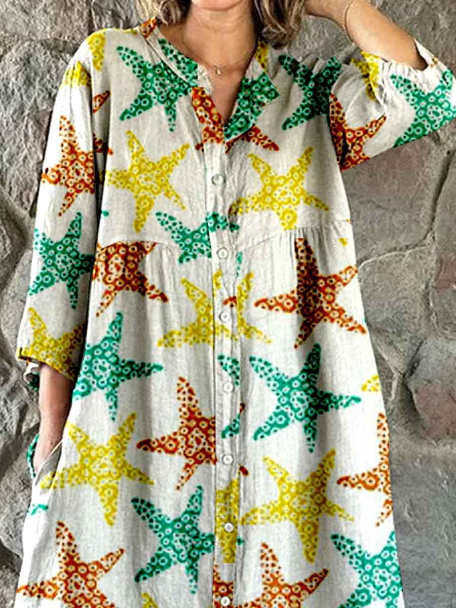 Women's Summer Fun Underwater World Starfish Pattern Shirt Style Cotton And Linen Dress