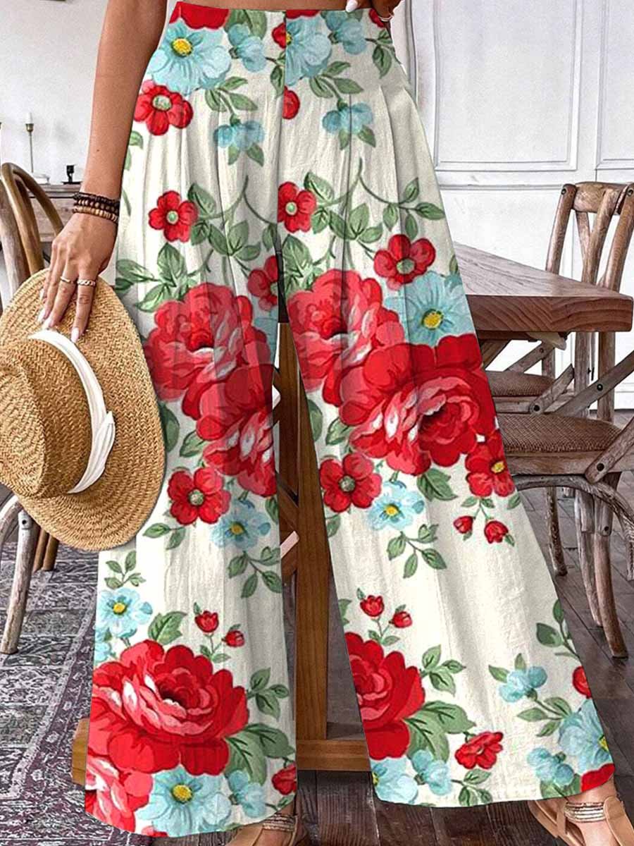 Women's Summer Rose Floral Print Pattern Cotton Wide Leg Pants