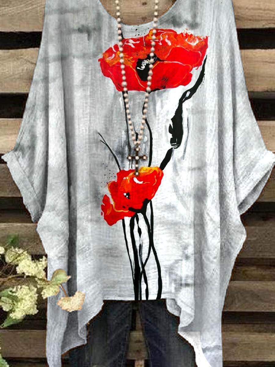 Women's V-Neck Art Oil Painting Poppy Floral Print Top